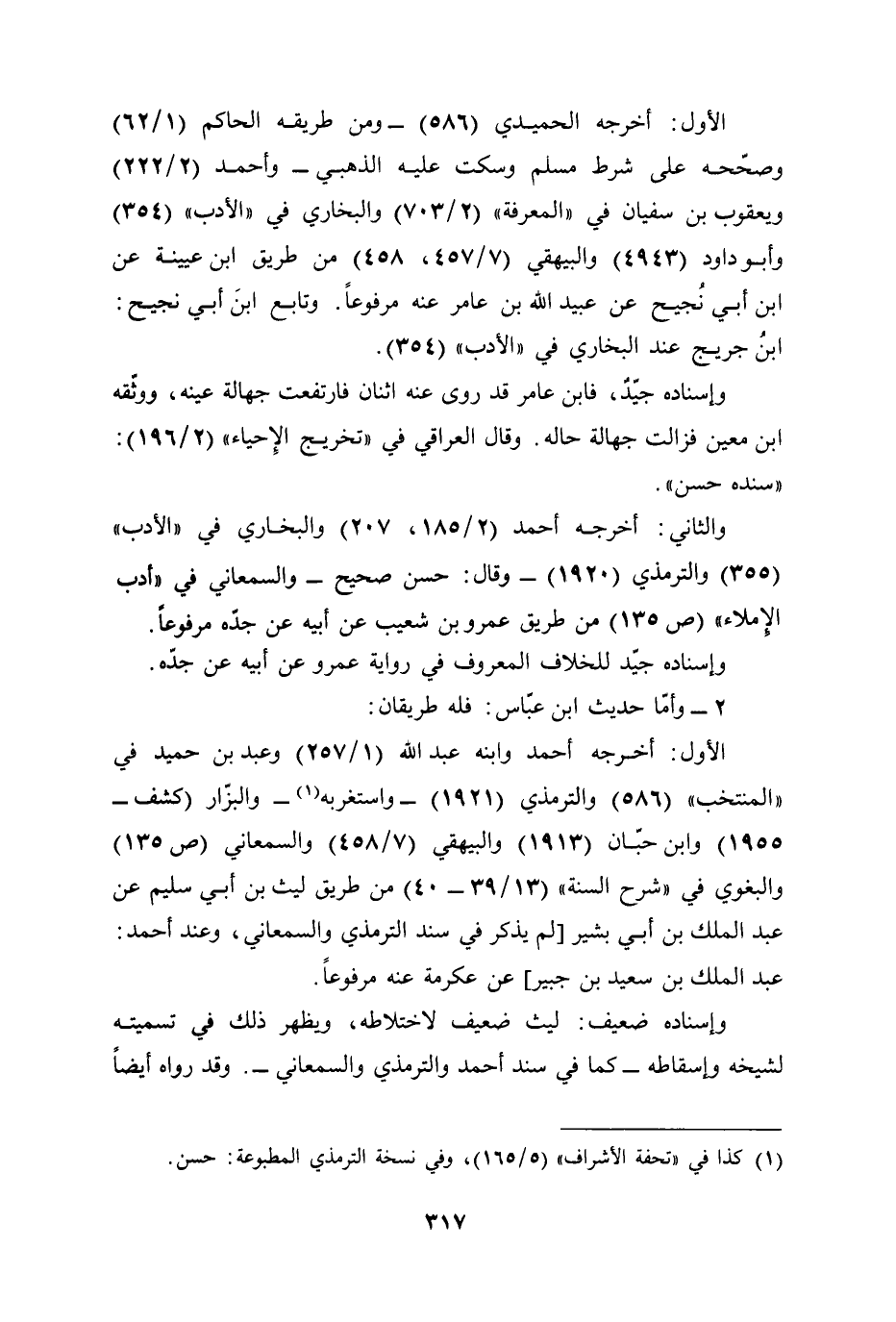 الأول: أخرجه الحميدي (586) -ومن طريقه الحاكم (1/ 62) وصحّحه على شرط مسلم وسكت عليه الذهبي- وأحمد (2/ 222) ويعقوب بن سفيان في "المعرفة" (2/ 703) والبخاري في "الأدب" (354) وأبو داود (4943) والبيهقي (7/ 457، 458) من طريق ابن عيينة عن ابن أبي نُجيح عن عبيد الله بن عامر عنه مرفوعًا. وتابع ابنَ أبي نجيح: ابنُ جريج عند البخاري في "الأدب" (354).