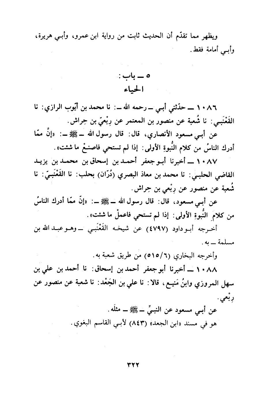 عن أبي مسعود، قال: قال رسول الله - صلى الله عليه وسلم -: "إنّ ممّا أدرك الناسُ من كلامِ النُّبوةِ الأولى: إذا لم تستحي فاعملْ ما شئت".