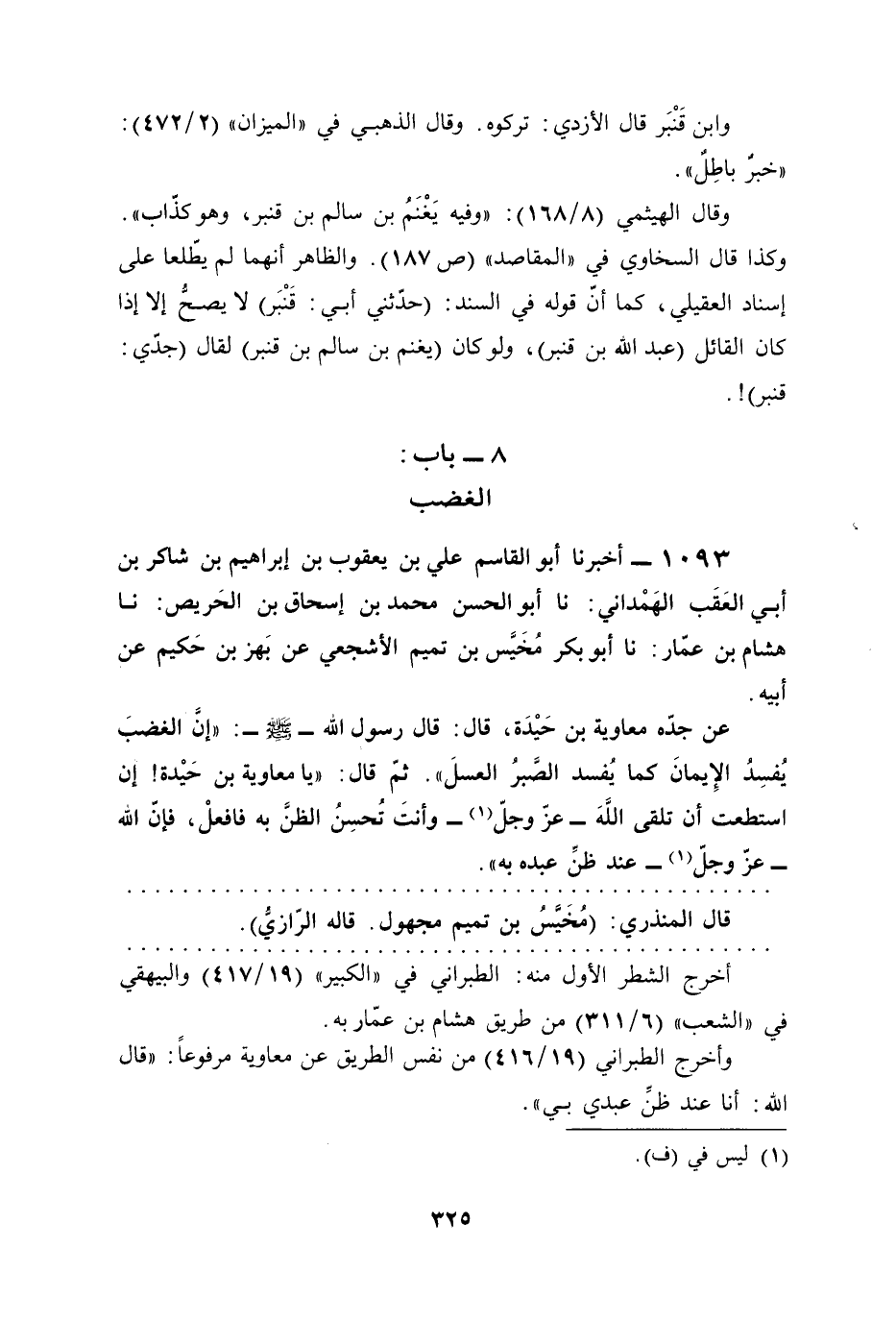 1093 - أخبرنا أبو القاسم علي بن يعقوب بن إبراهيم بن شاكر بن أبي العَقَب الهَمْداني: نا أبو الحسن محمد بن إسحاق بن الحَريص: نا هشام بن عمّار: نا أبو بكر مُخَيَّس بن تميم الأشجعي عن بَهز بن حَكيم عن أبيه.