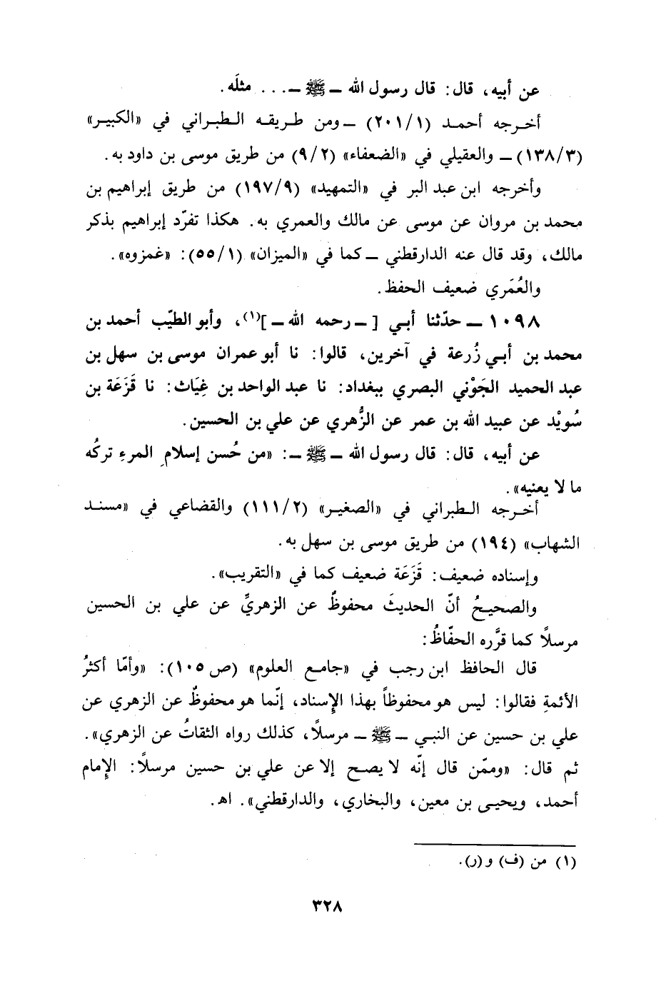 قال الحافظ ابن رجب في "جامع العلوم " (ص 105): "وأمّا أكثرُ الأئمةِ فقالوا: ليس هو محفوظًا بهذا الإسناد، إنما هو محفوظٌ عن الزهري عن علي بن حسين عن النبي - صلى الله عليه وسلم - مرسلًا، كذلك رواه الثقاتُ عن الزهري". ثم قال: "وممّن قال إنّه لا يصح إلا عن علي بن حسين مرسلًا: الإِمام