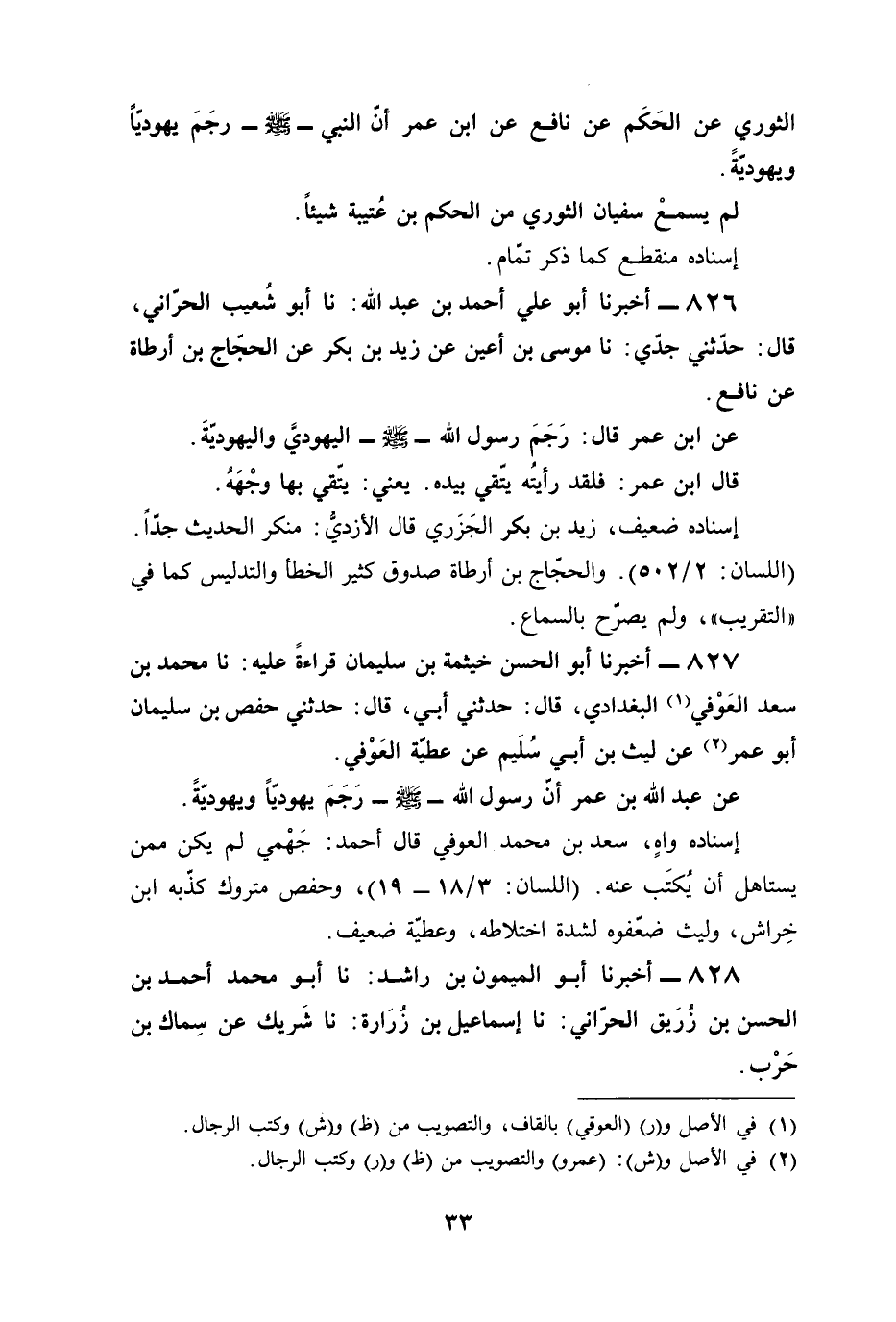 الثوري عن الحَكَم عن نافع عن ابن عمر أن النبي - صلى الله عليه وسلم -رجَمَ يهوديًّا ويهوديّةً.