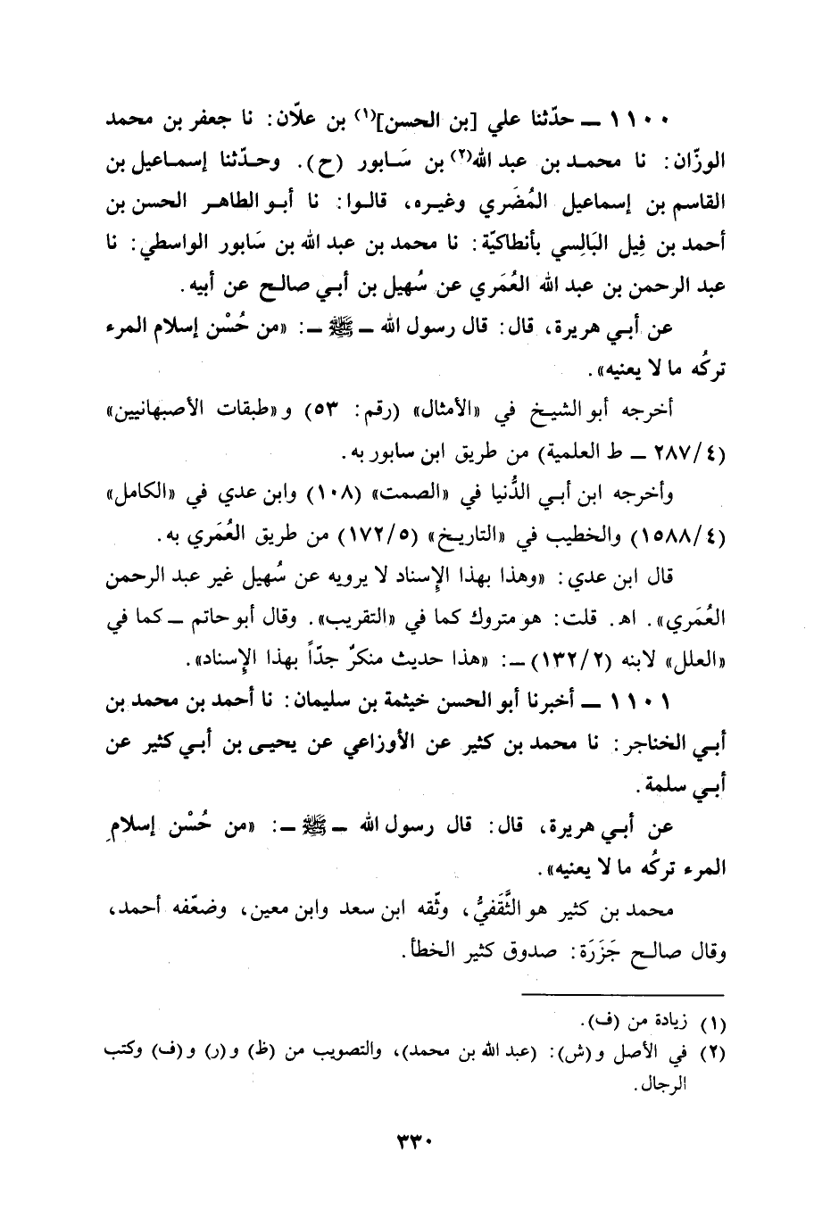 1100 - حدّثنا علي [بن الحسن] (¬1) بن علّان: نا جعفر بن محمد الوزّان: نا محمد بن عبد الله (¬2) بن سَابور (ح). وحدّثنا إسماعيل بن القاسم بن إسماعيل المُضَري وغيره، قالوا: نا أبو الطاهر الحسن بن أحمد بن فِيل البَالِسي بأنطاكيّة: نا محمد بن عبد الله بن سَابور الواسطي: نا عبد الرحمن بن عبد الله العُمَري عن سُهيل بن أبي صالح عن أبيه.