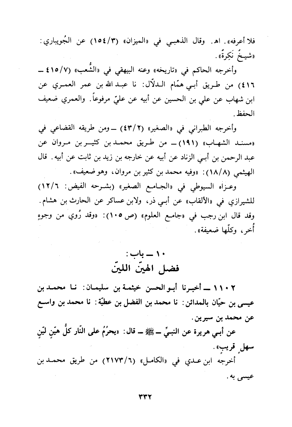 وأخرجه الحاكم في "تاريخه" وعنه البيهقي في "الشُّعب" (7/ 415 - 416) من طريق أبي همّام الدلّال: نا عبد الله بن عمر العمري عن ابن شهاب عن علي بن الحسين عن أبيه عن عليّ مرفوعًا. والعمري ضعيف الحفظ.