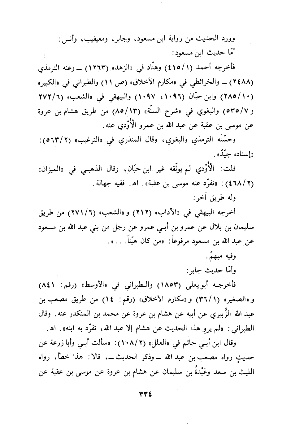 فأخرجه أحمد (1/ 415) وهنّاد في "الزهد" (1263) -وعنه الترمذي (2488) - والخرائطي في "مكارم الأخلاق" (ص 11) والطبراني في "الكبير" (10/ 285) وابن حبّان (1096، 1097) والبيهقي في "الشعب" (6/ 272 و 7/ 535) والبغوي في "شرح السنّة" (13/ 85) من طريق هشام بن عروة عن موسى بن عقبة عن عبد الله بن عمرو الْأوْدي عنه.
