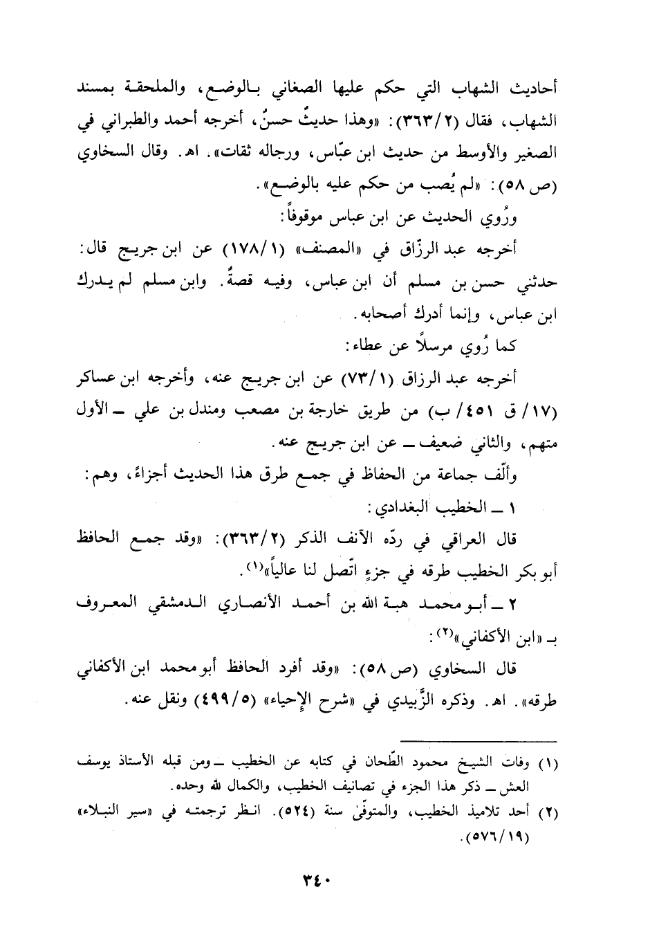 أحاديث الشهاب التي حكم عليها الصغاني بالوضع، والملحقة بمسند الشهاب، فقال (2/ 363): "وهذا حديثٌ حسنٌ، أخرجه أحمد والطبراني في الصغير والأوسط من حديث ابن عبّاس، ورجاله ثقات". أهـ. وقال السخاوي (ص 58): "لم يُصب من حكم عليه بالوضع".