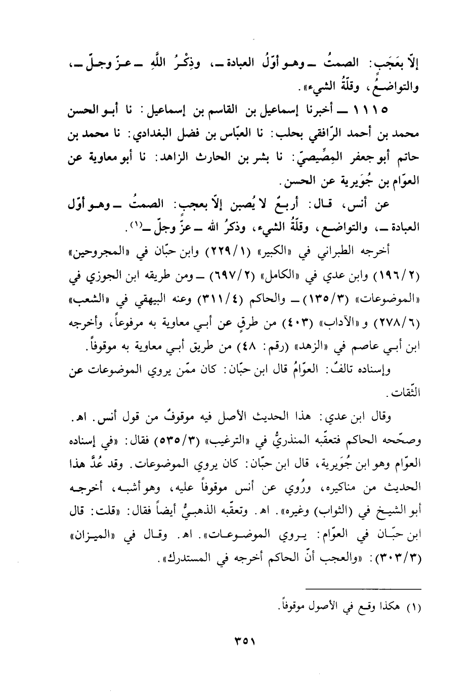 1115 - أخبرنا إسماعيل بن القاسم بن إسماعيل: نا أبو الحسن محمد بن أحمد الرّافقي بحلب: نا العبّاس بن فضل البغدادي: نا محمد بن حاتم أبو جعفر المِصِّيصيّ: نا بشر بن الحارث الزاهد: نا أبو معاوية عن العوّام بن جُوَيرية عن الحسن.