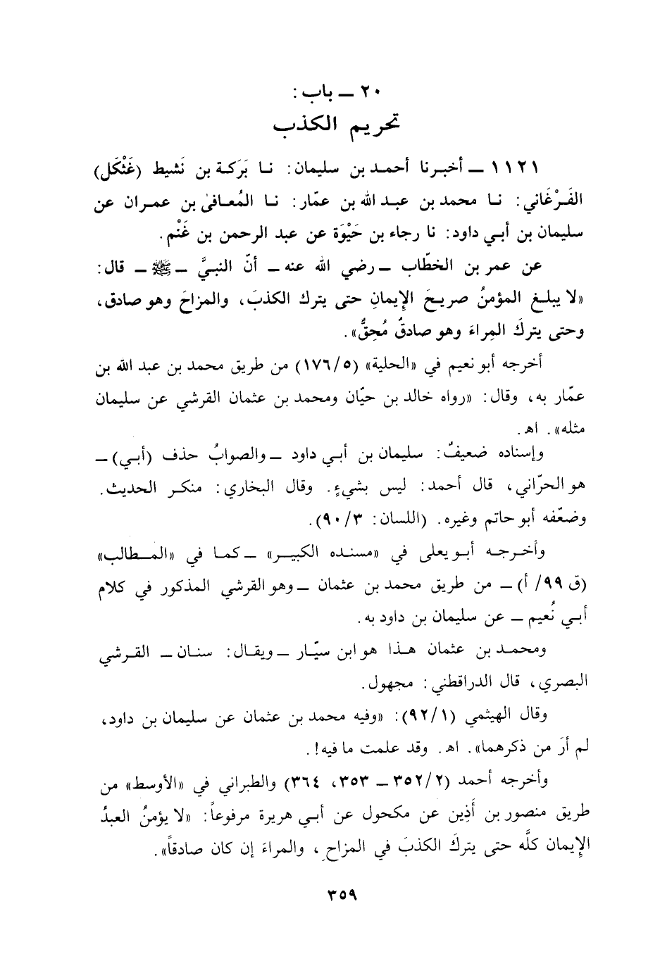 1121 - أخبرنا أحمد بن سليمان: نا بَرَكة بن نَشيط (غَثْكَل) الفَرْغَاني: نا محمد بن عبد الله بن عمّار: نا المُعافى بن عمران عن سليمان بن أبي داود: نا رجاء بن حَيْوَة عن عبد الرحمن بن غَنْم.