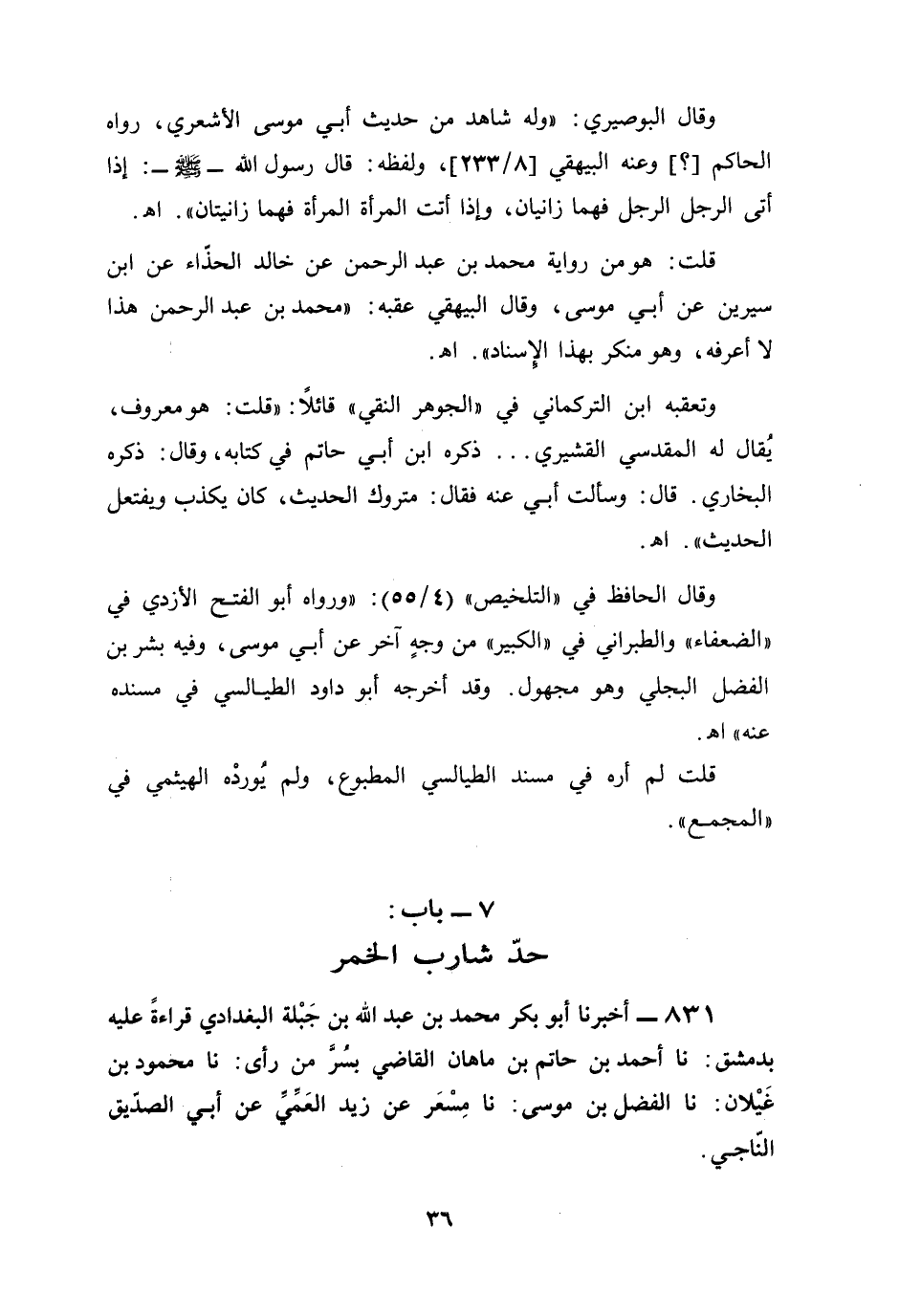 قلت: هو من رواية محمد بن عبد الرحمن عن خالد الحذّاء عن ابن سيرين عن أبي موسى، وقال البيهقي عقبه: "محمد بن عبد الرحمن هذا لا أعرفه، وهو منكر بهذا الإسناد". أهـ.