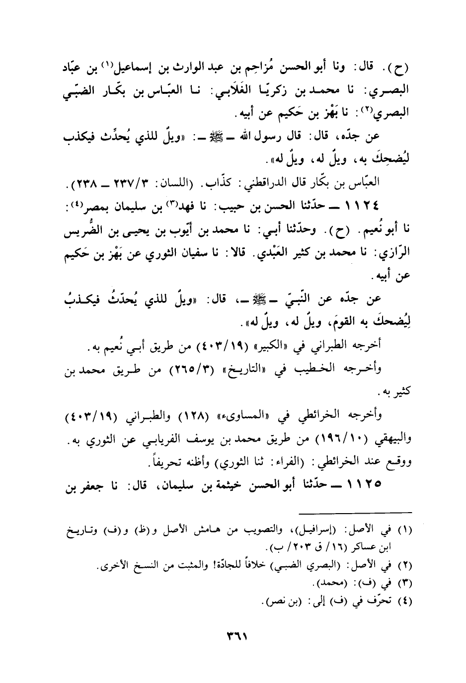 1124 - حدّثنا الحسن بن حبيب: نا فهد (¬3) بن سليمان بمصر (¬4): نا أبو نُعيم. (ح). وحدّثنا أبي: نا محمد بن أيّوب بن يحيى بن الضُّريس الرّازي: نا محمد بن كثير العَبْدي. قالا: نا سفيان الثوري عن بَهْز بن حَكيم عن أبيه.