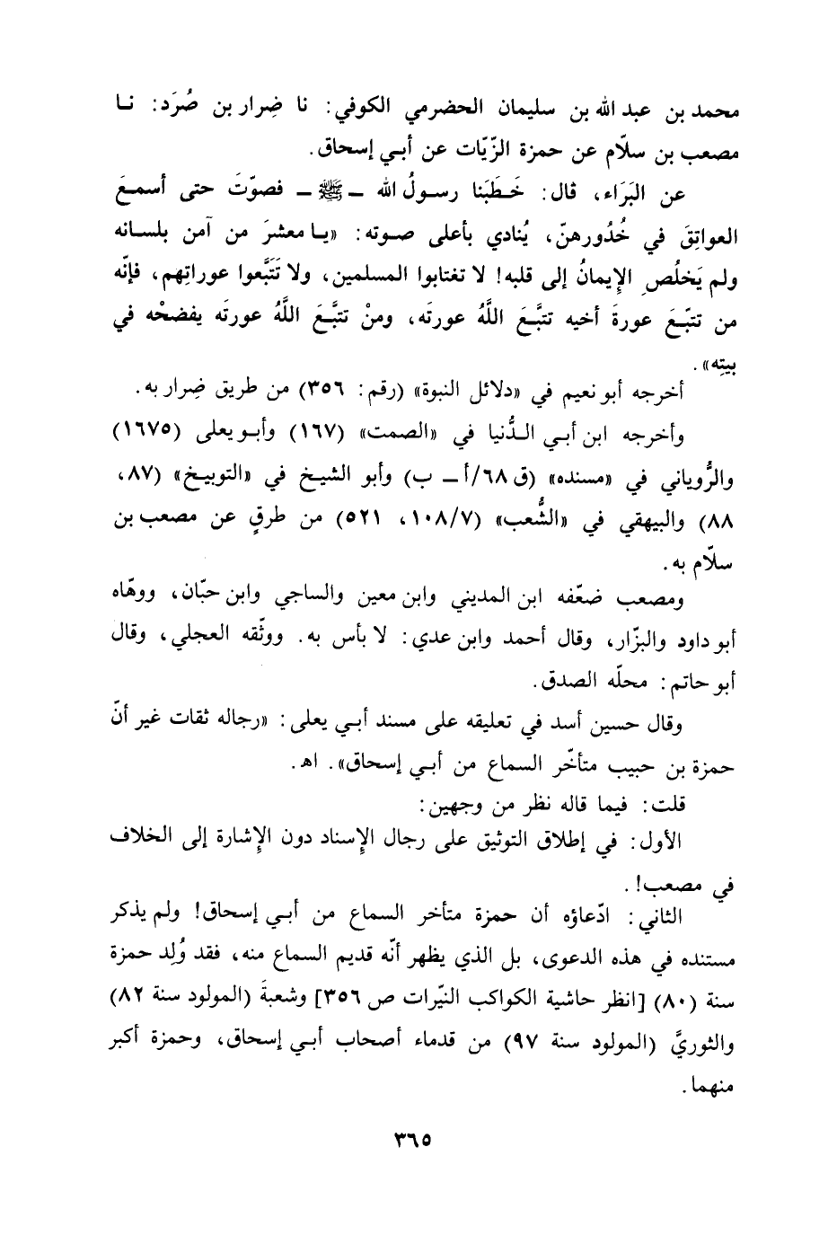 محمد بن عبد الله بن سليمان الحضرمي الكوفي: نا ضِرار بن صُرَد: نا مصعب بن سلّام عن حمزة الزّيّات عن أبي إسحاق.
