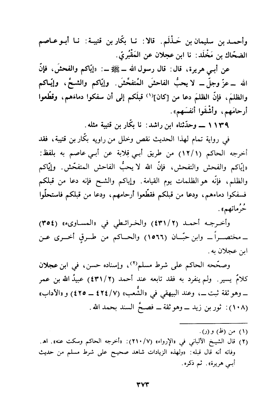 وصحّحه الحاكم على شرط مسلم (¬2)، وإسناده حسن، في ابن عجلان كلامٌ يسير. ولم ينفرد به فقد تابعه عند أحمد (2/ 431) عبيدُ الله بن عمر -وهو ثقة ثبت-، وعند البيهقي في "الشُّعب" (7/ 424 - 425) و"الآداب" (108): ثور بن زيد -وهو ثقة- فصحَّ السند بحمد الله.