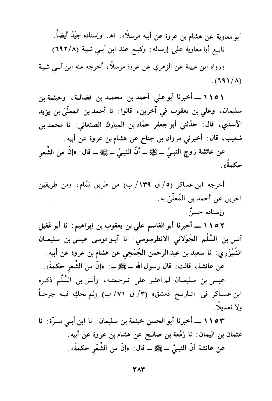 1151 - أخبرنا أبو علي أحمد بن محمد بن فضالة، وخيثمة بن سليمان، وعلي بن يعقوب في آخرين، قالوا: نا أحمد بن المعلّى بن يزيد الأسدي، قال: حدّثني أبو جعفر حمّاد بن المبارك الصنعاني: نا محمد بن شعيب، قال: أخبرني مروان بن جناح عن هشام بن عروة عن أبيه.