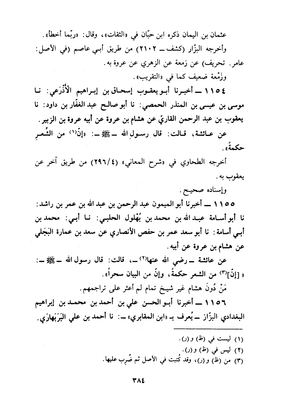 1154 - أخبرنا أبو يعقوب إسحاق بن إبراهيم الْأذْرَعي: نا موسى بن عيسى بن المنذر الحمصي: نا أبو صالح عبد الغفار بن داود: نا يعقوب بن عبد الرحمن القاريّ عن هشام بن عروة عن أبيه عروة بن الزبير.