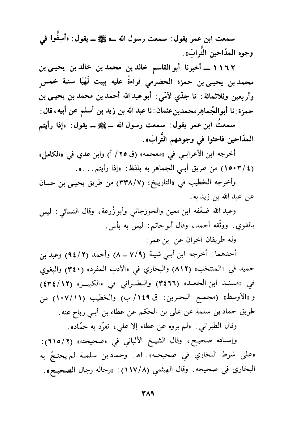 1162 - أخبرنا أبو القاسم خالد بن محمد بن خالد بن يحيى بن محمد بن يحيى بن حمزة الحضرمي قراءةً عليه ببيت لَهْيَا سنة خمسٍ وأربعين وثلاثمائة: نا جدّي لأمّي. أبو عبد الله أحمد بن محمد بن يحيى بن حمزة: نا أبو الجُماهِر محمد بن عثمان: نا عبد الله بن زيد بن أسلم عن أبيه، قال: