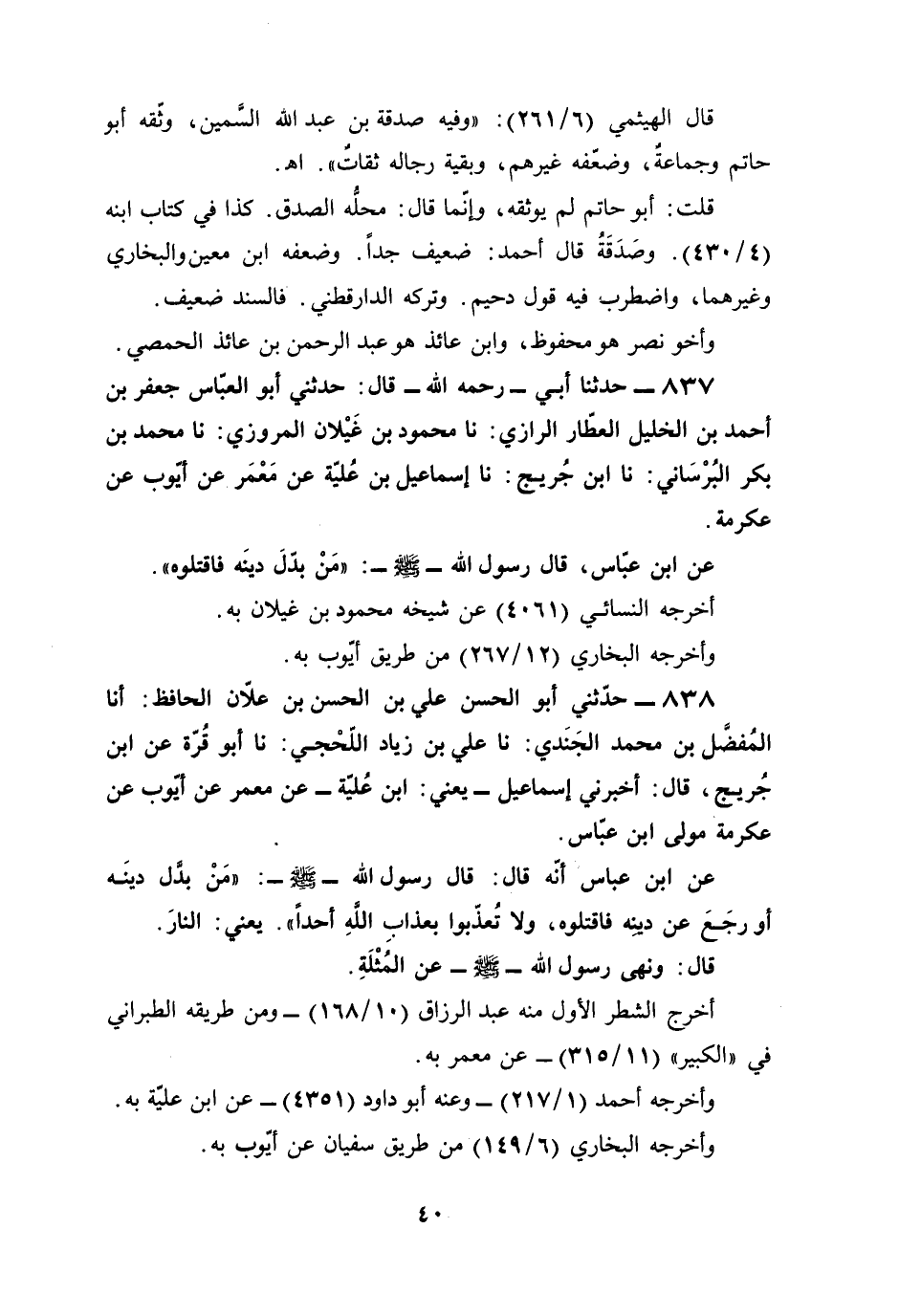 837 - حدثنا أبي -رحمه الله- قال: حدثني أبو العبّاس جعفر بن أحمد بن الخليل العطّار الرازي: نا محمود بن غَيْلان المروزي: نا محمَّد بن بكر البُرْسَاني: نا ابن جُريج: نا إسماعيل بن عُلية عن مَعْمَر عن أيّوب عن عكرمة.