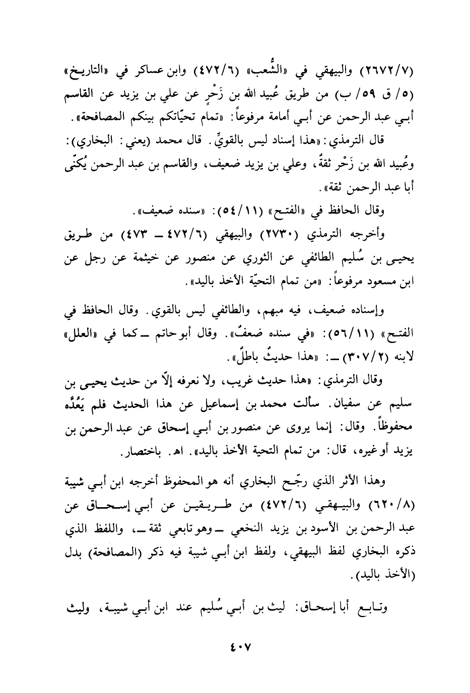 وقال الترمذي: "هذا حديث غريب، ولا نعرفه إلّا من حديث يحيى بن سليم عن سفيان. سألت محمد بن إسماعيل عن هذا الحديث فلم يَعُدَّه محفوظًا. وقال: إنما يروى عن منصور بن أبي إسحاق عن عبد الرحمن بن يزيد أو غيره، قال: من تمام التحية الأخذ باليد". أهـ. باختصار.