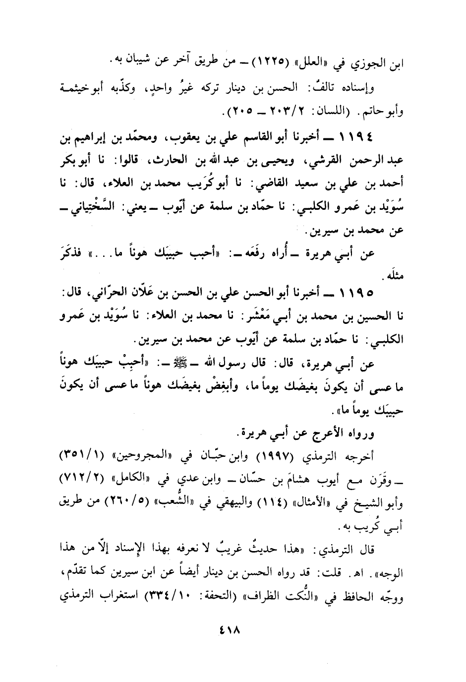 1195 - أخبرنا أبو الحسن علي بن الحسن بن عَلّان الحرّاني، قال: نا الحسين بن محمد بن أبي مَعْشَر: نا محمد بن العلاء: نا سُوَيْد بن عَمرو الكلبي: نا حمّاد بن سلمة عن أيّوب عن محمد بن سيرين.