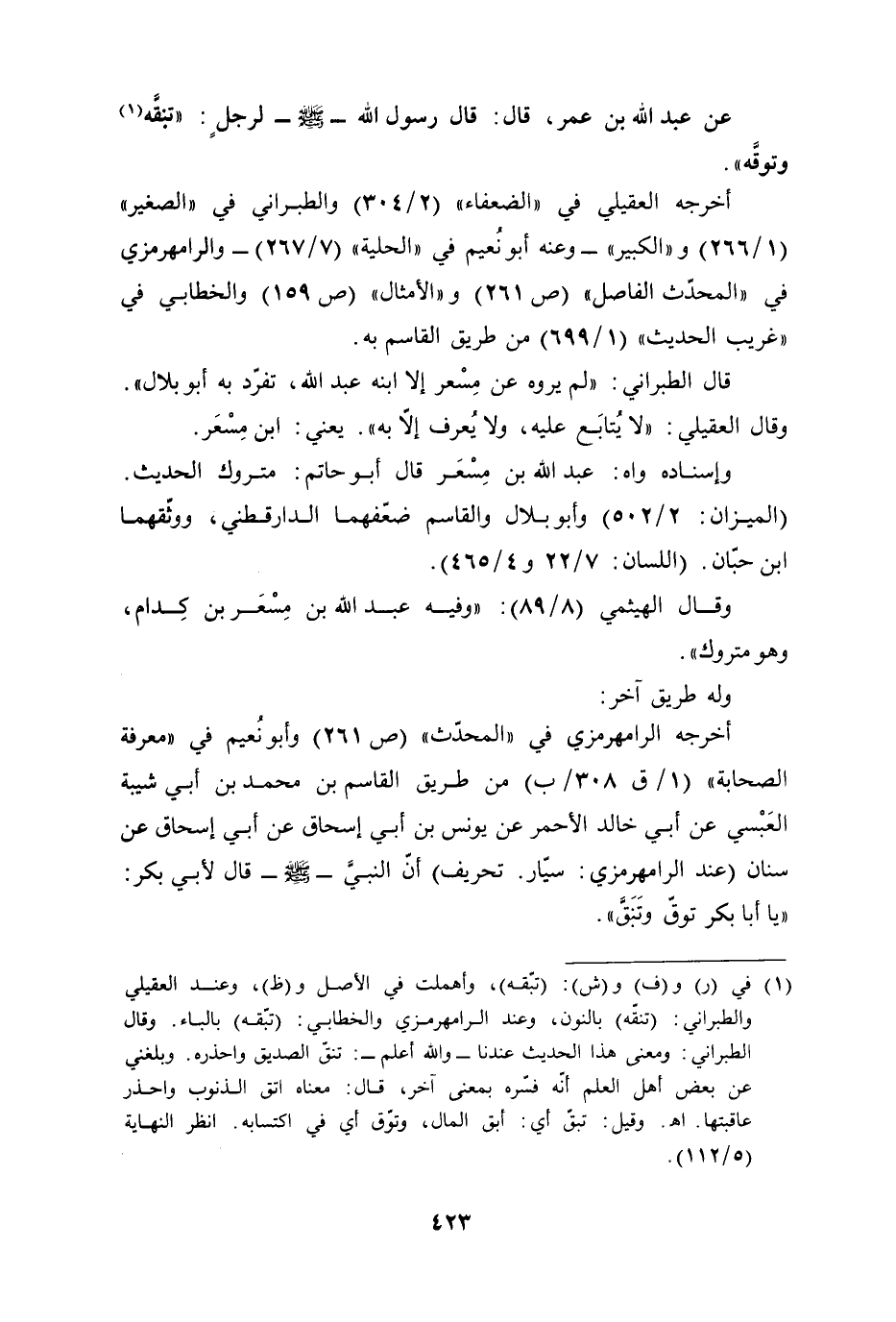 (¬1) في (ر) و (ف) و (ش): (تبّقه)، وأهملت في الأصل و (ظ)، وعند العقيلي والطبراني: (تنقّه) بالنون، وعند الرامهرمزي والخطابي: (تبّقه) بالباء. وقال الطبراني: ومعني هذا الحديث عندنا -والله أعلم-: تنقّ الصديق واحذره. وبلغني عن بعض أهل العلم أنّه فسّره بمعنى آخر، قال: معناه اتق الذنوب واحذر عاقبتها. أهـ. وقيل: تبقّ أي: أبق المال، وتوّق أي في اكتسابه. انظر النهاية (5/ 112)