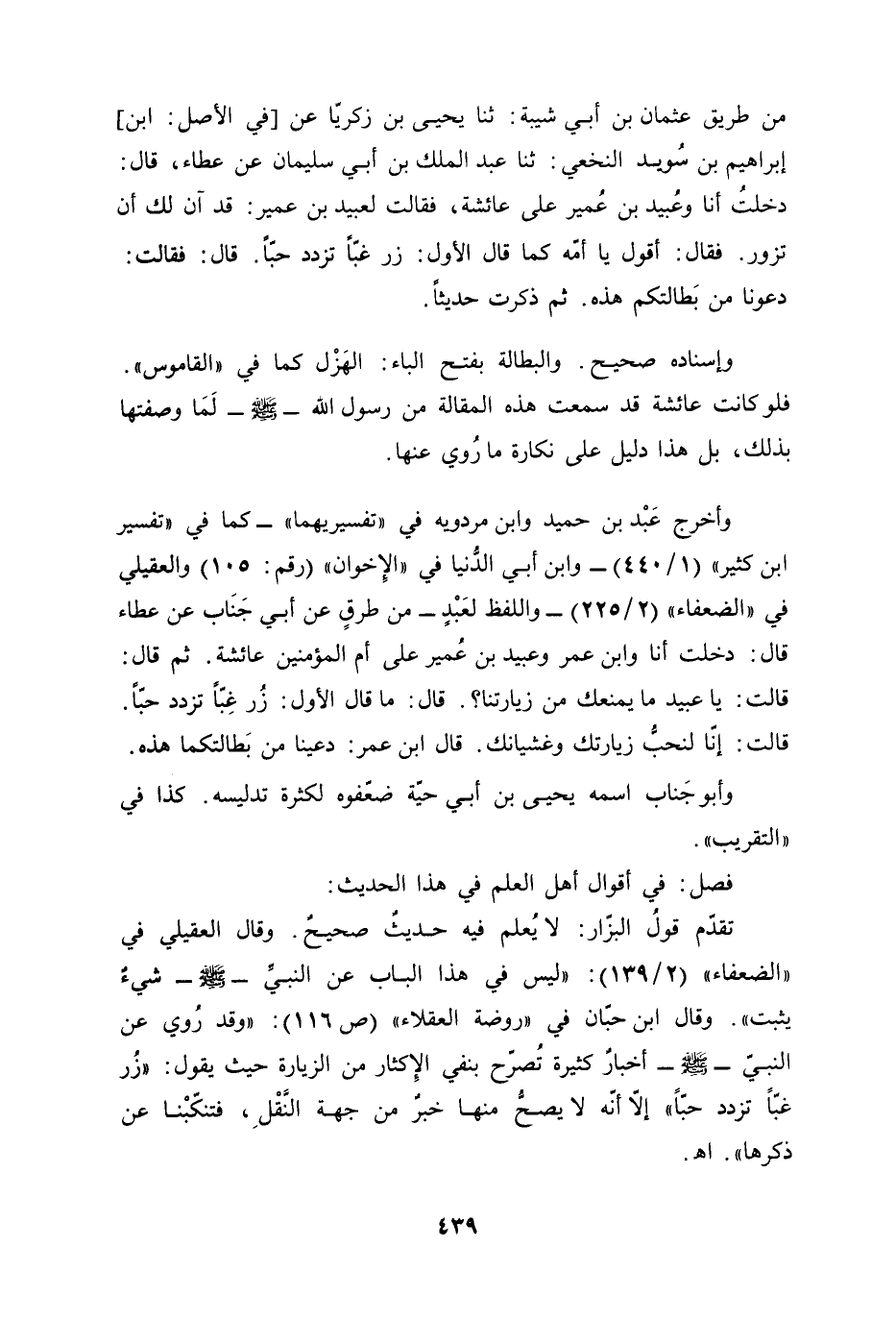 وأخرج عَبْد بن حميد وابن مردويه في "تفسيريهما" -كما في "تفسير ابن كثير" (1/ 440) - وابن أبي الدُّنيا في "الِإخوان" (رقم: 105) والعقيلي في "الضعفاء" (2/ 225) -واللفظ لعَبْدٍ- من طرقٍ عن أبي جَنَاب عن عطاء قال: دخلت أنا وابن عمر وعبيد بن عُمير على أم المؤمنين عائشة. ثم قال: قالت: يا عبيد ما يمنعك من زيارتنا؟. قال: ما قال الأول: زُر غِبًّا تزدد حبًّا. قالت: إنّا لنحبُّ زيارتك وغشيانك. قال ابن عمر: دعينا من بَطالتكما هذه.