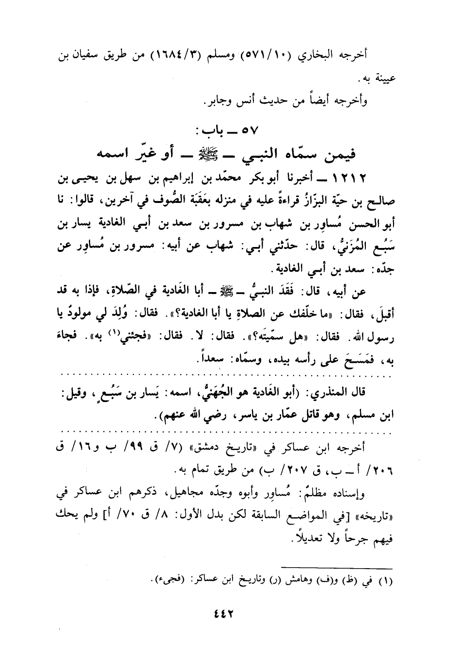1212 - أخبرنا أبو بكر محمّد بن إبراهيم بن سهل بن يحيى بن صالح بن حيّة البزّازُ قراءةً عليه في منزله بعَقَبَة الصُّوف في آخرين، قالوا: نا أبو الحسن مُساوِر بن شهاب بن مسرور بن سعد بن أبي الغادية يسار بن سَبُع المُزَنيُّ، قال: حدّثني أبي: شهاب عن أبيه: مسرور بن مُساوِر عن جدّه: سعد بن أبي الغادية.
