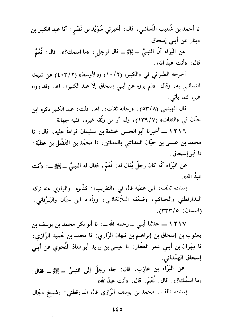 عن البَرَاء أنّه كان رجلٌ يُقال له: نُعْمٌ، فقال له النبيُّ - صلى الله عليه وسلم -: "أنت عبدُ الله".