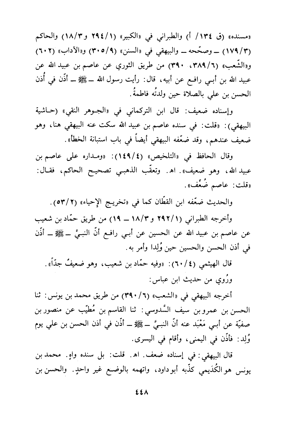 "مسنده" (ق 134/ أ) والطبراني في "الكبير" (1/ 294 و 3/ 18) والحاكم (3/ 179) -وصحّحه- والبيهقي في "السنن" (9/ 305) و"الآداب" (602) و"الشّعب" (6/ 389، 390) من طريق الثوري عن عاصم بن عبيد الله عن عبيد الله بن أبي رافع عن أبيه، قال: رأيت رسول الله -صلى الله عليه وسلم - أذّن في أُذن الحسن بن علي بالصلاة حين ولدتُه فاطمةُ.