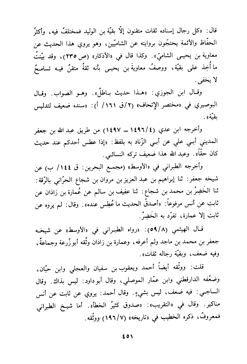 وقال ابن الجوزي: "هذا حديث باطلٌ". وهو الصواب. وقال البوصيري في "مختصر الِإتحاف" (2/ ق 161/ أ): "سنده ضعيف لتدليس بقيّة".
