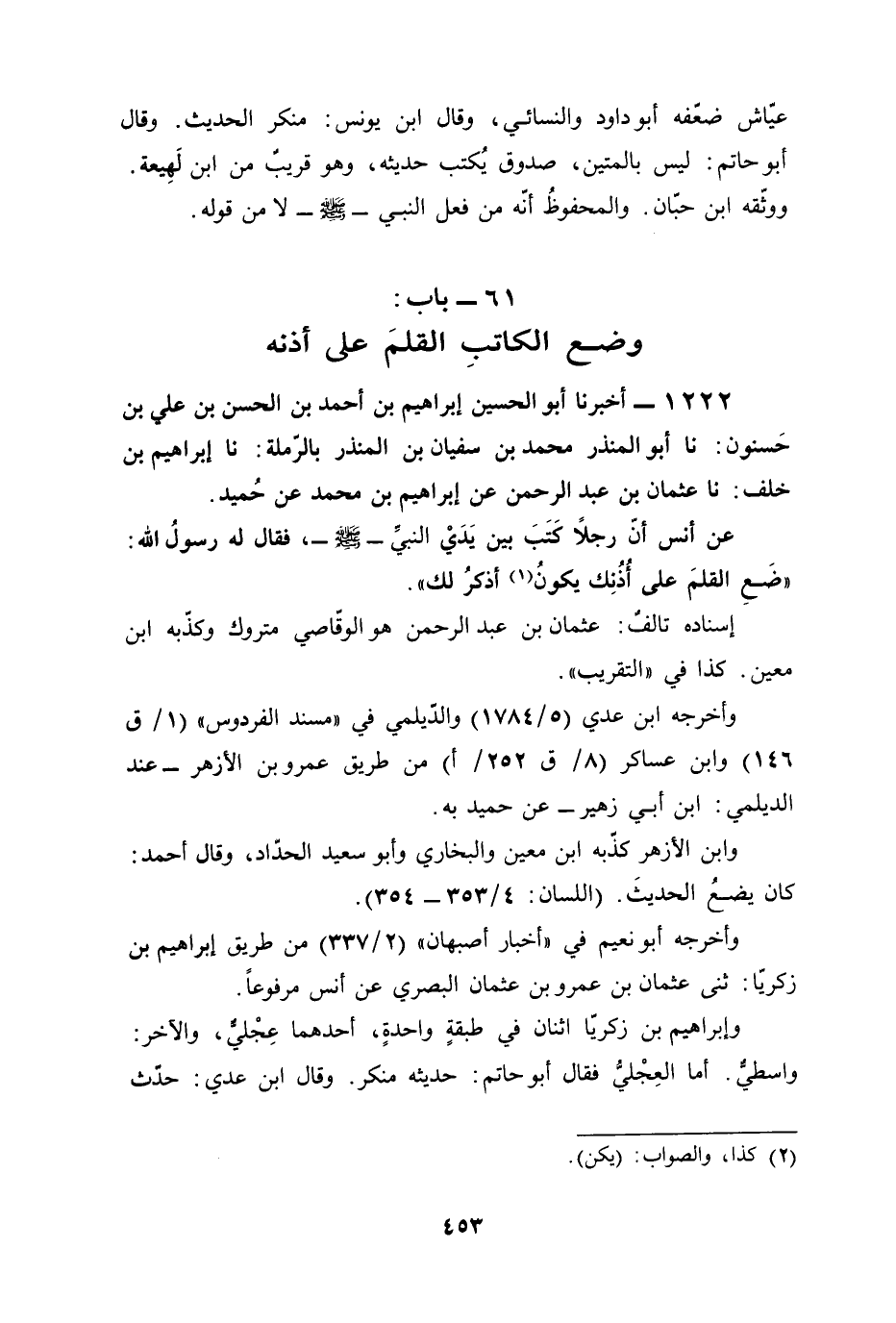 1222 - أخبرنا أبو الحسين إبراهيم بن أحمد بن الحسن بن علي بن حَسنون: نا أبو المنذر محمَّد بن سفيان بن المنذر بالرّملة: نا إبراهيم بن خلف: نا عثمان بن عبد الرحمن عن إبراهيم بن محمد عن حُميد.