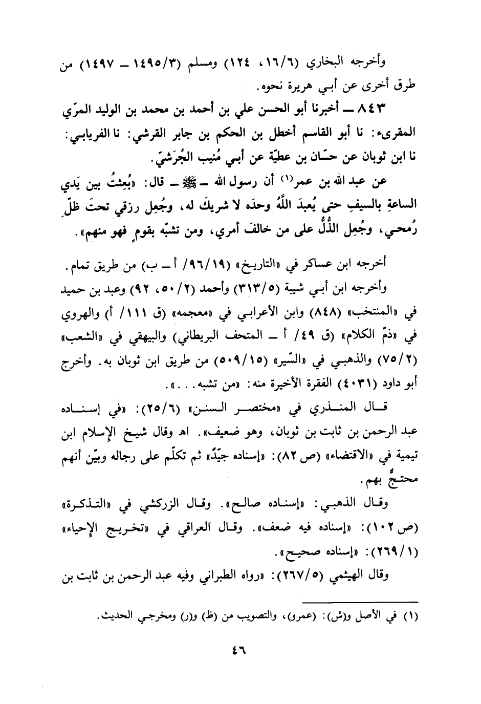 843 - أخبرنا أبو الحسن علي بن أحمد بن محمَّد بن الوليد المرّي المقرئ: نا أبو القاسم أخطل بن الحكم بن جابر القرشي: نا الفريابي: نا ابن ثوبان عن حسّان بن عطية عن أبي مُنيب الجُرَشيّ.