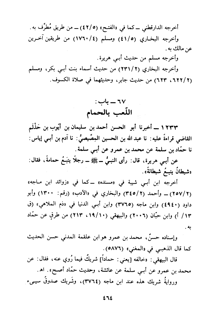 1233 - أخبرنا أبو الحسن أحمد بن سليمان بن أيّوب بن حَذْلَم القاضي قراءةً عليه: نا عبد الله بن الحسين المِصِّيصيُّ: نا آدم بن أبي إياس: نا حمّاد بن سلمة عن محمد بن عمرو عن أبي سلمة.