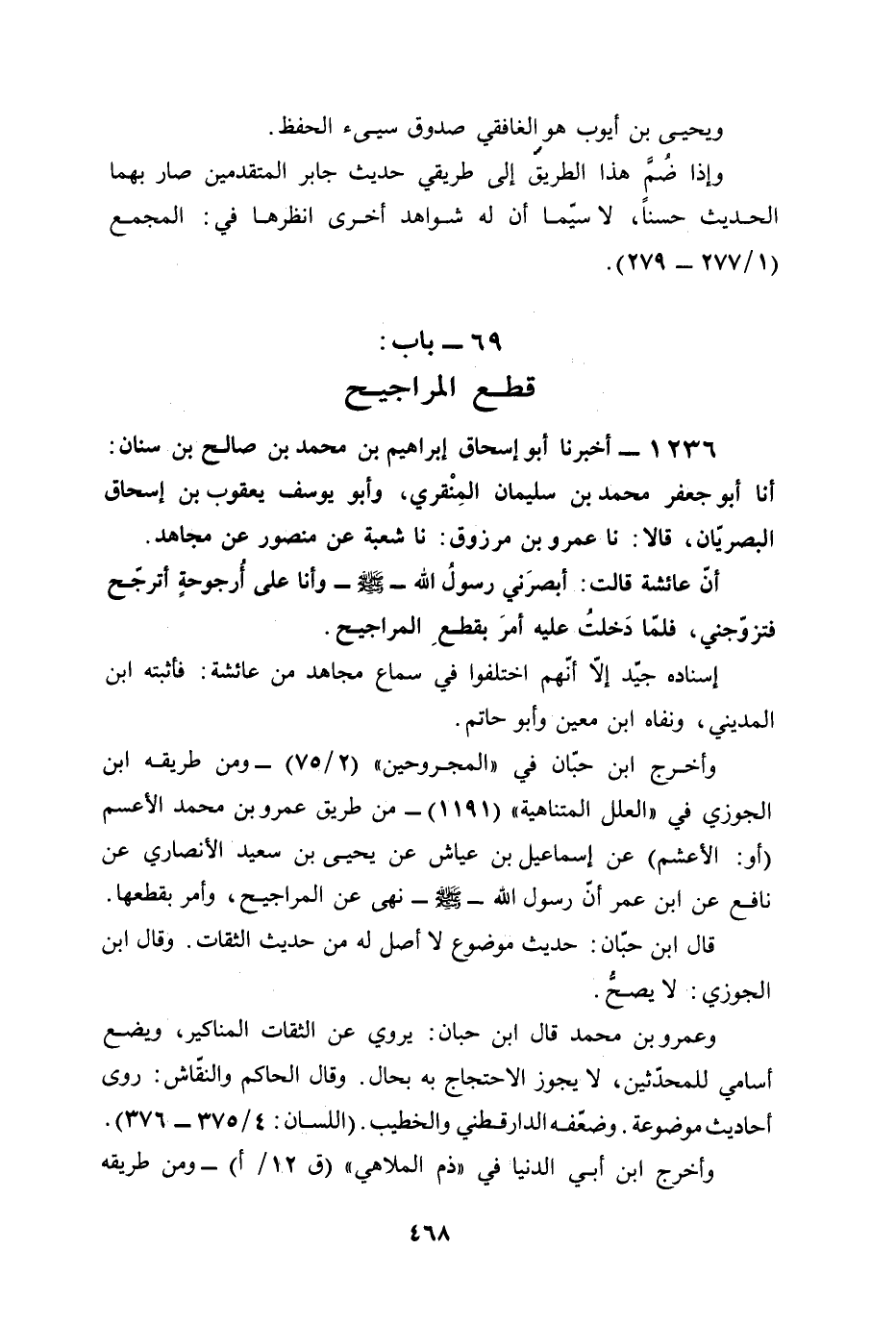 1236 - أخبرنا أبو إسحاق إبراهيم بن محمد بن صالح بن سنان: أنا أبو جعفر محمد بن سليمان المِنْقري، وأبو يوسف يعقوب بن إسحاق البصريّان، قالا: نا عمرو بن مرزوق: نا شعبة عن منصور عن مجاهد.