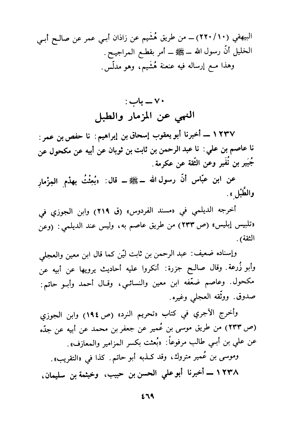 وأخرج الآجري في كتاب "تحريم النرد" (ص 194) وابن الجوزي (ص 233) من طريق موسى بن عُمير عن جعفر بن محمد عن أبيه عن جدّه عن علي بن أبي طالب مرفوعًا: "بُعثت بكسر المزامير والمعازف".