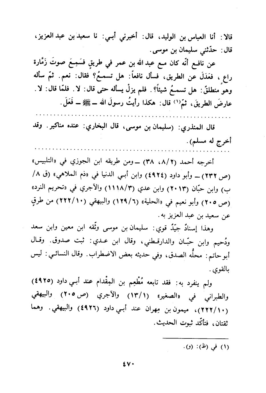 عن نافع أنّه كان مع عبد الله بن عمر في طريقٍ فسَمِعَ صوتَ زَمَّارة راعٍ، فعَدَلَ عن الطريق، فسأل نافعًا: هل تسمعُ؟ فقال: نعم. ثمّ سأله وهو منطلقٌ: هل تسمعُ شيئًا؟. فلم يزلْ يسأله حتى قال: لا. فلمّا قال: لا. عارضَ الطريقَ، ثمّ (¬1) قال: هكذا رأيتُ رسولَ الله - صلى الله عليه وسلم - فَعَلَ.