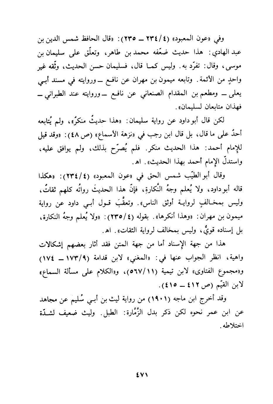 وفي "عون المعبود" (4/ 234 - 235): "قال الحافظ شمس الدين بن عبد الهادي: هذا حديث ضعّفه محمد بن طاهر، وتعلّق على سليمان بن موسى، وقال: تفرّد به. وليس كما قال، فسليمان حسن الحديث، وثّقه غير واحدٍ من الأئمة. وتابعه ميمون بن مهران عن نافع -وروايته في مسند أبي يعلى- ومطعم بن المقدام الصنعاني عن نافع -وروايته عند الطبراني- فهذان متابعان لسليمان".