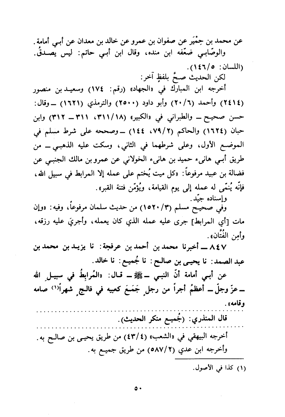 عن أبي أمامة أنّ النبي - صلى الله عليه وسلم - قال: "المُرابِطُ في سبيلِ الله -عَزَّ وَجَلَّ- أعظمُ أجرًا من رجلٍ جَمَعَ كعبيه في فالجٍ شهرًا (¬1) صامه وقامه.