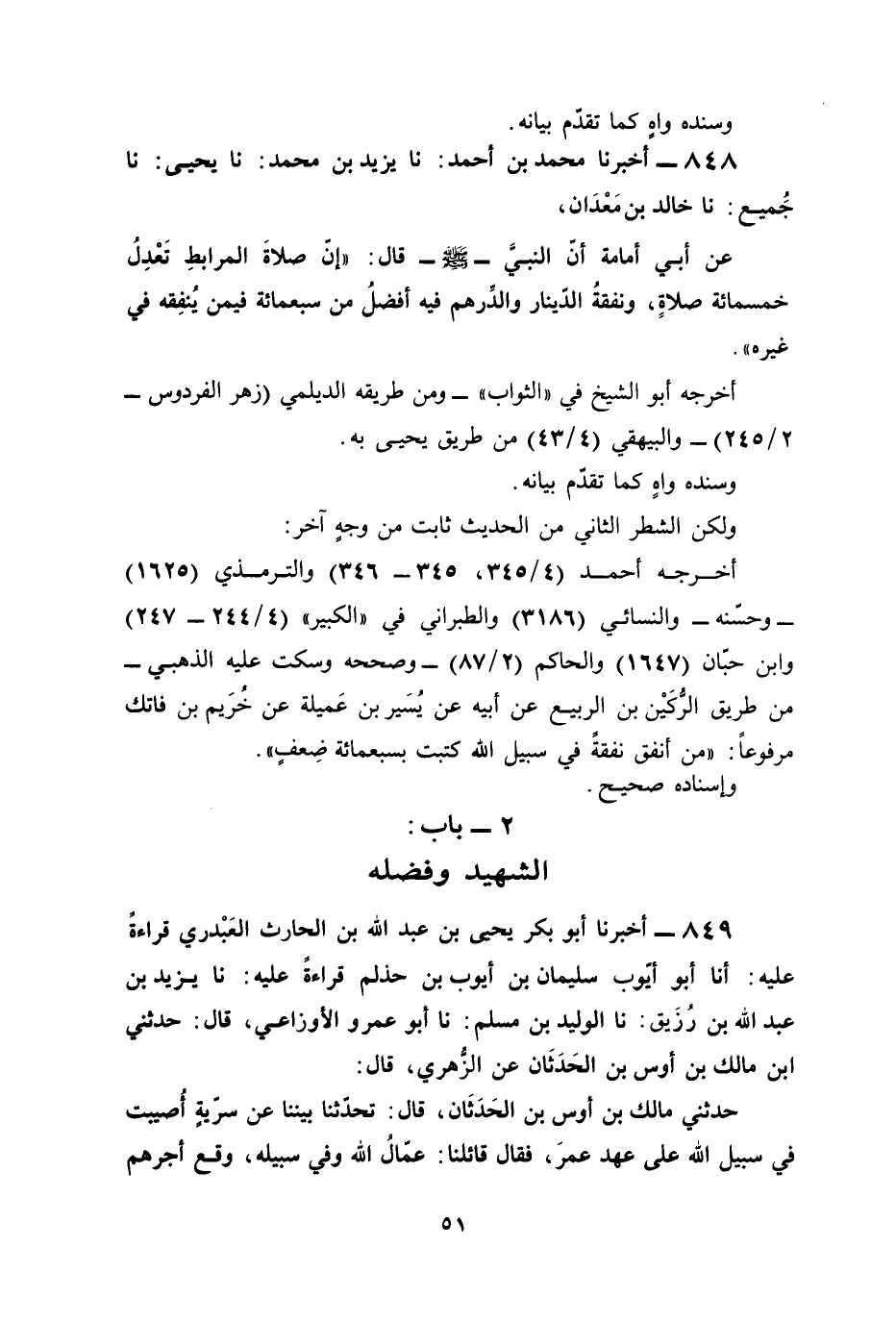 عن أبي أمامة أنّ النبيَّ - صلى الله عليه وسلم - قال: "إنّ صلاةَ المرابطِ تَعْدِلُ خمسمائة صلاةٍ، ونفقةُ الدّينار والدِّرهم فيه أفضلُ من سبعمائة فيمن يُنفِقه في غيره".