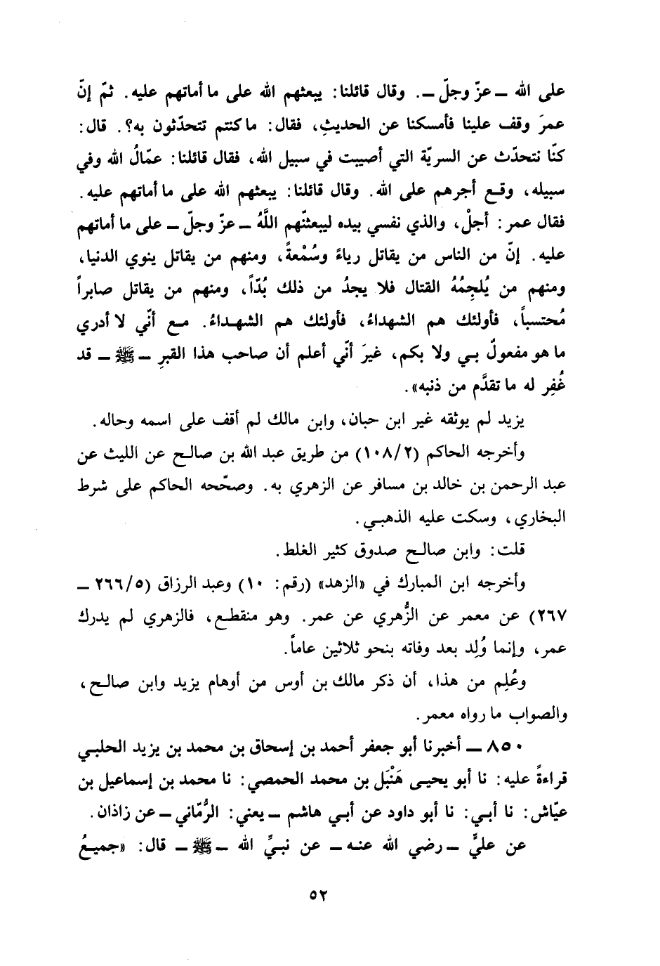 على الله -عَزَّ وَجَلَّ-. وقال قائلنا: يبعثهم الله على ما أماتهم عليه. ثمّ إنّ عمرَ وقف علينا فأمسكنا عن الحديثِ، فقال: ما كنتم تتحدّثون به؟. قال: كنّا نتحدّث عن السريّة التي أصيبت في سبيل الله، فقال قائلنا: عمّالُ الله وفي سبيله، وقع أجرهم على الله. وقال قائلنا: يبعثهم الله على ما أماتهم عليه. فقال عمر: أجلْ، والذي نفسي بيده ليبعثنّهم اللهُ- عَزَّ وجَلَّ- على ما أماتهم عليه. إنّ من الناس من يقاتل رياءً وسُمْعةً، ومنهم من يقاتل ينوي الدنيا، ومنهم من يُلجِمُهُ القتال فلا يجدُ من ذلك بُدًّا، ومنهم من يقاتل صابرًا مُحتسبًا، فأولئك هم الشهداءُ، فأولئك هم الشهداءُ. مع أنّي لا أدري ما هو مفعولٌ بي ولا بكم، غيرَ أني أعلم أن صاحب هذا القبرِ - صلى الله عليه وسلم - قد غُفِر له ما تقدَّم من ذنبه".