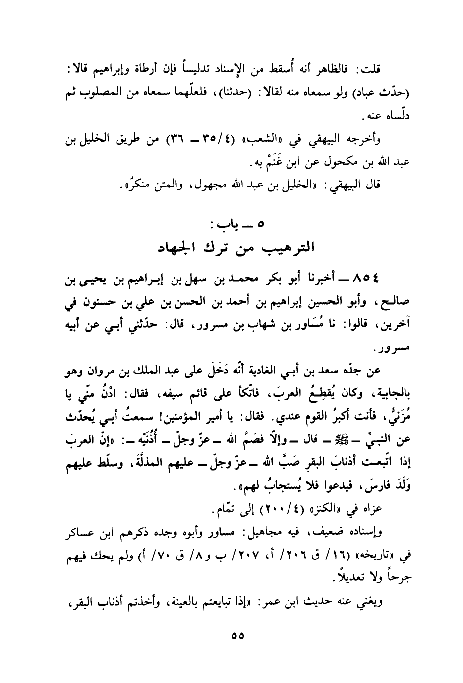 قلت: فالظاهر أنه أُسقط من الإسناد تدليسًا فإن أرطاة وإبراهيم قالا: (حدّث عباد) ولو سمعاه منه لقالا: (حدثنا)، فلعلّهما سمعاه من المصلوب ثم دلّساه عنه.