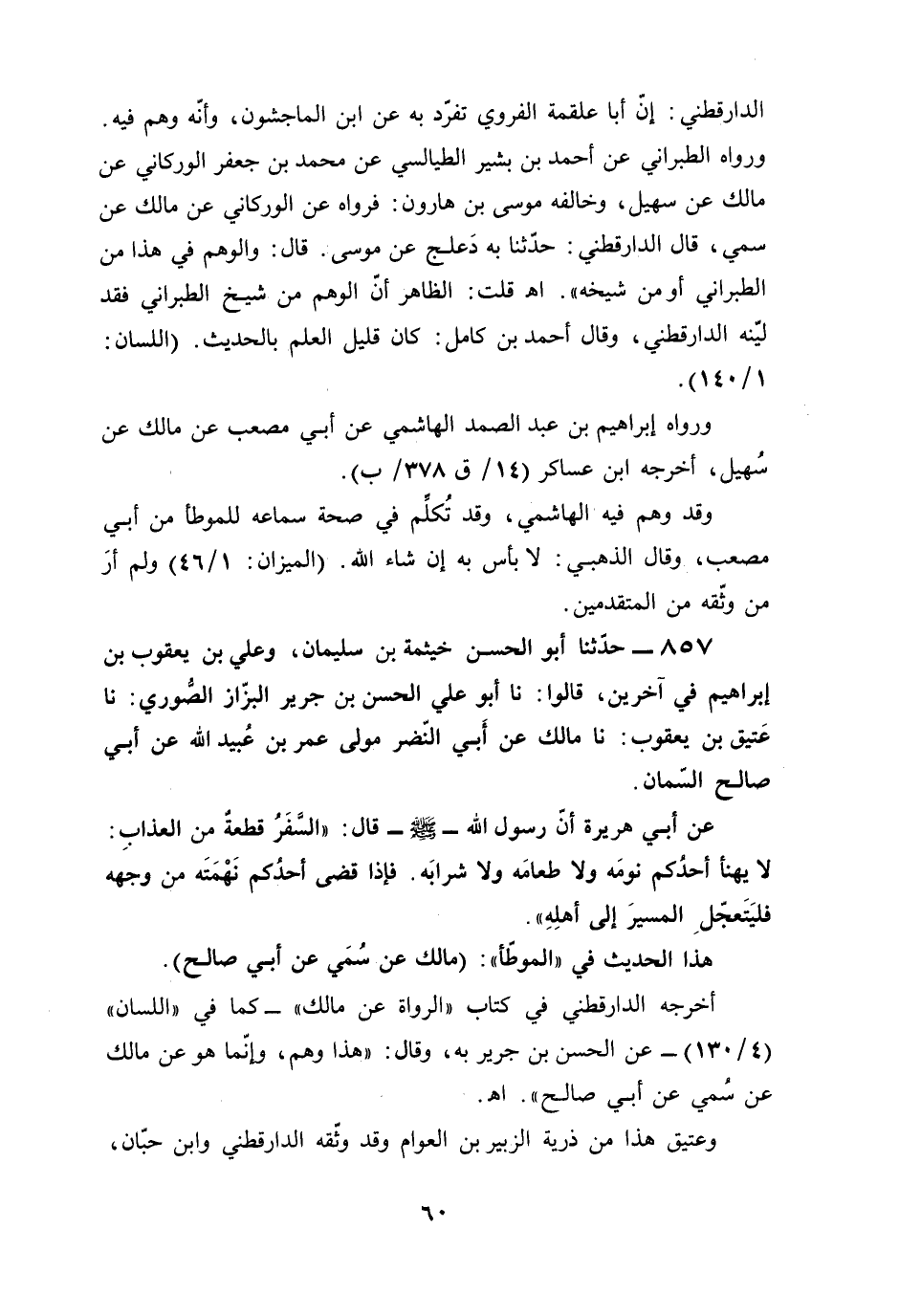 الدارقطني: إنّ أبا علقمة الفروي تفرّد به عن ابن الماجشون، وأنّه وهم فيه. ورواه الطبراني عن أحمد بن بشير الطيالسي عن محمَّد بن جعفر الوركاني عن مالك عن سهيل، وخالفه موسى بن هارون: فرواه عن الوركاني عن مالك عن سمي، قال الدارقطني: حدّثنا به دَعلج عن موسى. قال: والوهم في هذا من الطبراني أو من شيخه". أهـ قلت: الظاهر أن الوهم من شيخ الطبراني فقد ليّنه الدارقطني، وقال أحمد بن كامل: كان قليل العلم بالحديث. (اللسان: 1/ 140).