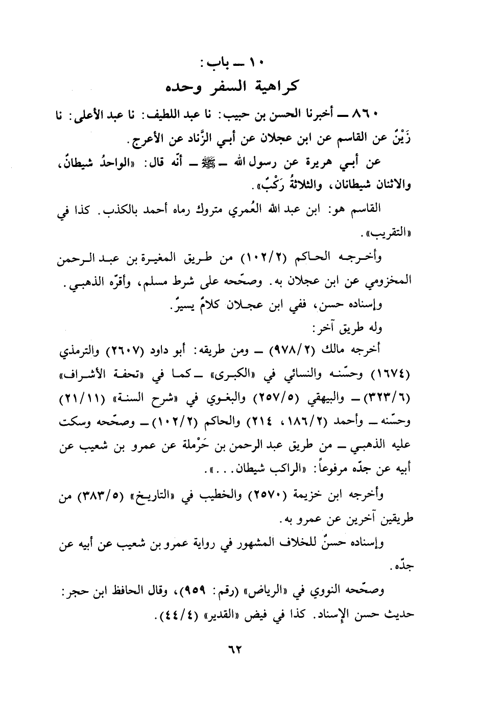 عن أبي هريرة عن رسول الله - صلى الله عليه وسلم - أنّه قال: "الواحدُ شيطانٌ، والاثنان شيطانان، والثلاثةُ رَكْبٌ".