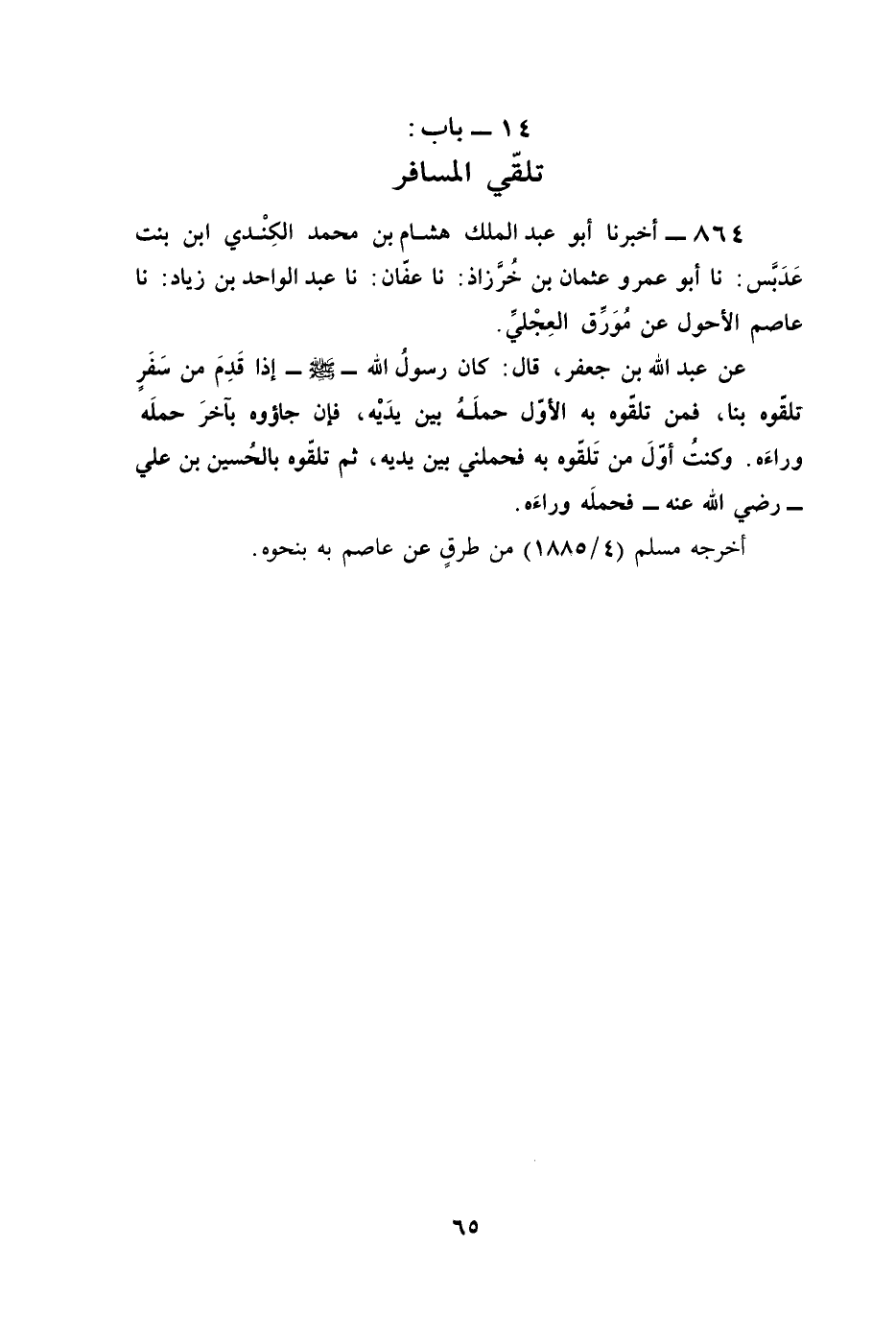 عن عبد الله بن جعفر، قال: كان رسولُ الله - صلى الله عليه وسلم - إذا قَدِمَ من سَفَرٍ تلقّوه بنا، فمن تلقّوه به الأوّل حملَهُ بين يدَيْه، فإن جاؤوه بآخرَ حملَه وراءَه. وكنتُ أوّلَ من تَلقّوه به فحملني بين يديه، ثم تلقوه بالحُسين بن علي - رضي الله عنه - فحملَه وراءَه.
