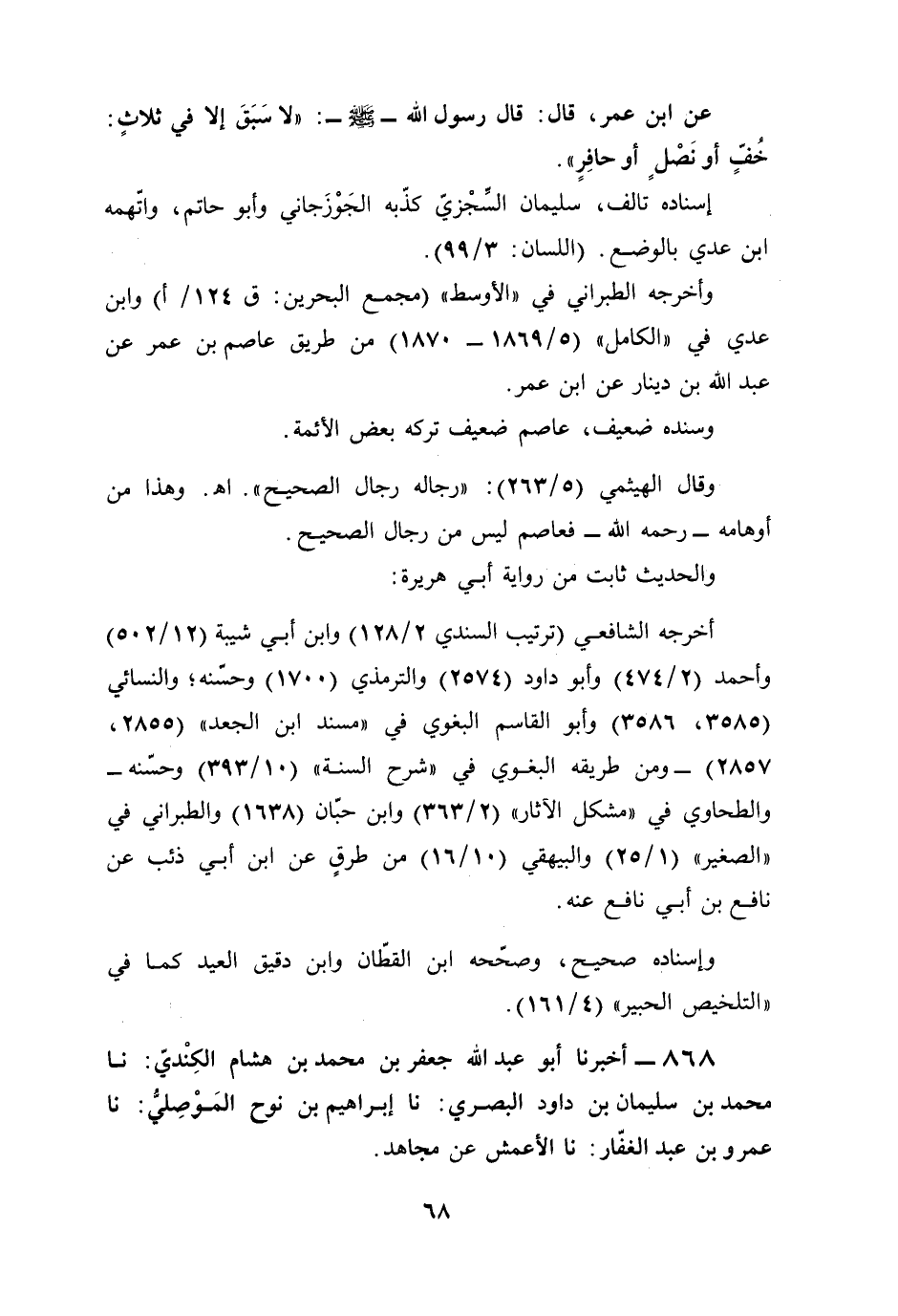 868 - أخبرنا أبو عبد الله جعفر بن محمد بن هشام الكِنْديّ: نا محمد بن سليمان بن داود البصري: نا إبراهيم بن نوح المَوْصِليُّ: نا عمرو بن عبد الغفّار: نا الأعمش عن مجاهد.