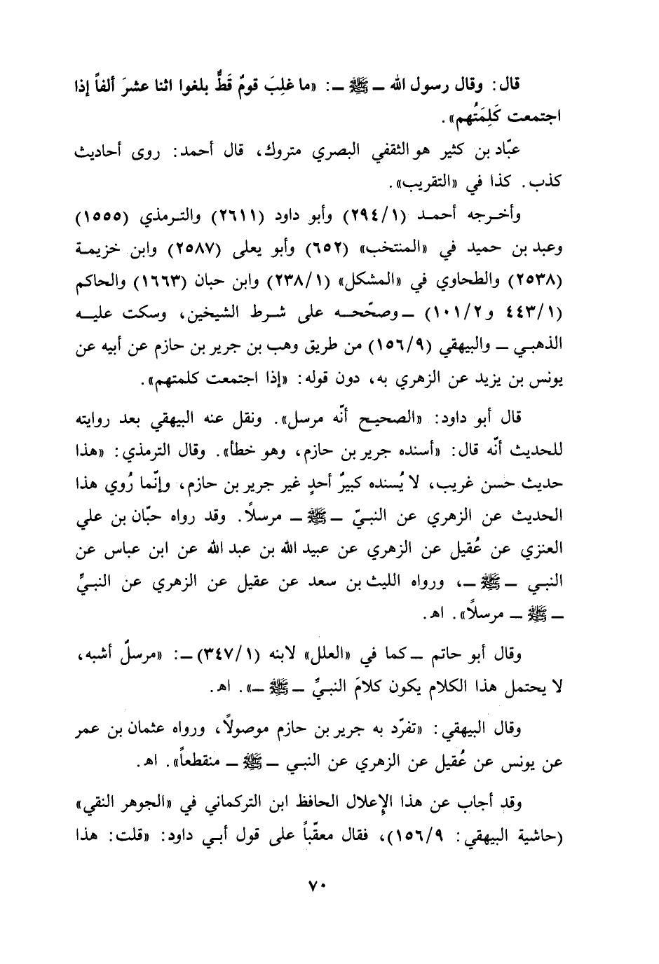 وقال البيهقي: "تفرّد به جرير بن حازم موصولًا، ورواه عثمان بن عمر عن يونس عن عُقيل عن الزهري عن النبي - صلى الله عليه وسلم - منقطعًا". أهـ.