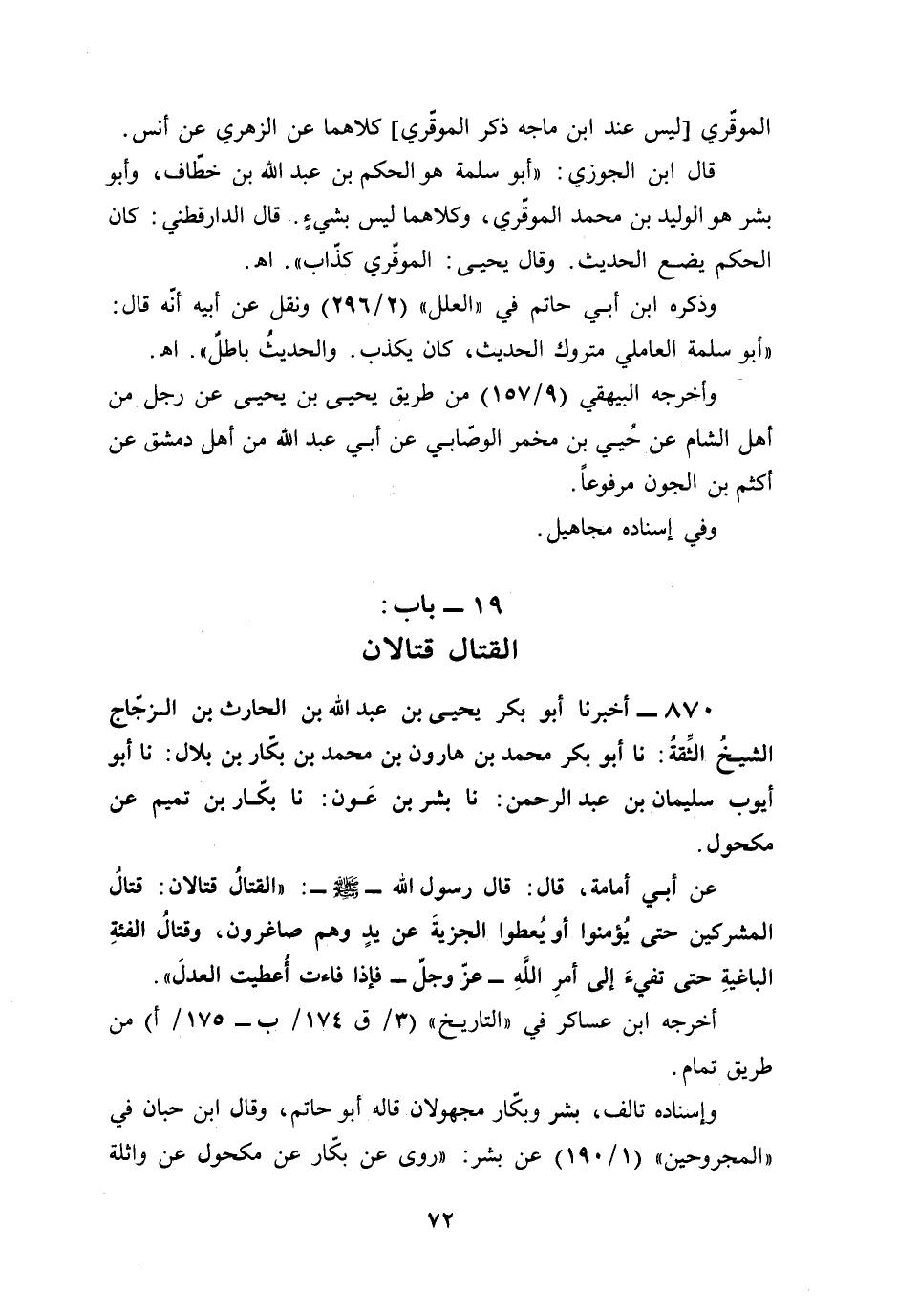 870 - أخبرنا أبو بكر يحيى بن عبد الله بن الحارث بن الزجّاج الشيخُ الثِّقةُ: نا أبو بكر محمد بن هارون بن محمد بن بكّار بن بلال: نا أبو أيوب سليمان بن عبد الرحمن: نا بشر بن عَون: نا بكّار بن تميم عن مكحول.