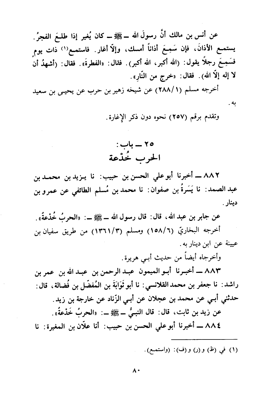 عن جابر بن عبد الله، قال: قال رسول الله - صلى الله عليه وسلم -: " الحربُ خدْعةٌ".