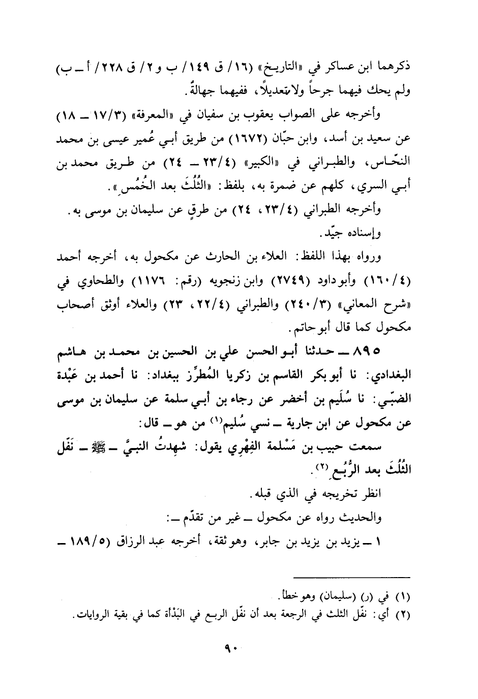 895 - حدثنا أبو الحسن علي بن الحسين بن محمد بن هاشم البغدادي: نا أبو بكر القاسم بن زكريا المُطرِّز ببغداد: نا أحمد بن عَبْدة الضبّي: نا سُلَيم بن أخضر عن رجاء بن أبي سلمة عن سليمان بن موسى عن مكحول عن ابن جارية -نسي سُليم (¬1) من هو- قال: