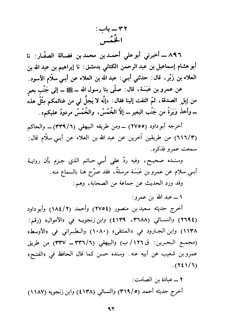 عن عمرو بن عَبَسَة، قال: صلّى بنا رسول الله - صلى الله عليه وسلم - إلى جَنْبِ بعيرٍ من إبِلِ الصدقة، ثمّ التفت إلينا فقال: "إنَّه لا يَحِلُّ لي من غنائمكم مِثْلُ هذه -وأخذَ وَبَرَةً من جَنْب البعير- إلّا الخُمُسُ، والخُمُسُ مردودٌ عليكم".