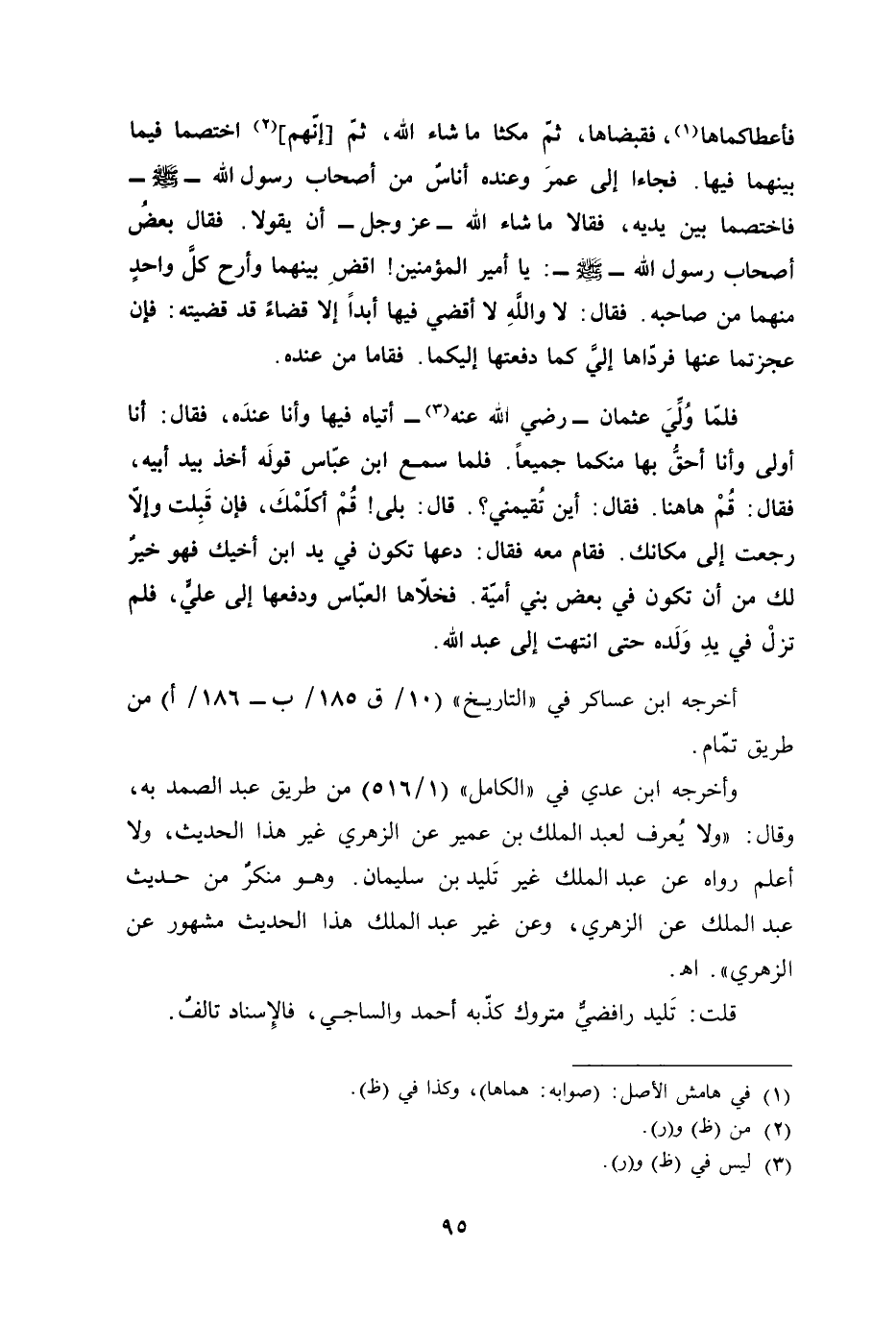 فلمّا وُلِّيَ عثمان -رضي الله عنه (¬3) - أتياه فيها وأنا عندَه، فقال: أنا أولى وأنا أحقُّ بها منكما جميعًا. فلما سمع ابن عبّاس قولَه أخذ بيد أبيه، فقال: قمْ ها هنا. فقال: أين تُقيمني؟. قال: بلى! قُمْ أكلّمْكَ، فإن قَبِلت وإلاّ رجعت إلى مكانك. فقام معه فقال: دعها تكون في يد ابن أخيك فهو خيرٌ لك من أن تكون في بعض بني أميّة. فخلاّها العبّاس ودفعها إلى عليٍّ، فلم تزلْ في يدِ وَلَده حتى انتهت إلى عبد الله.