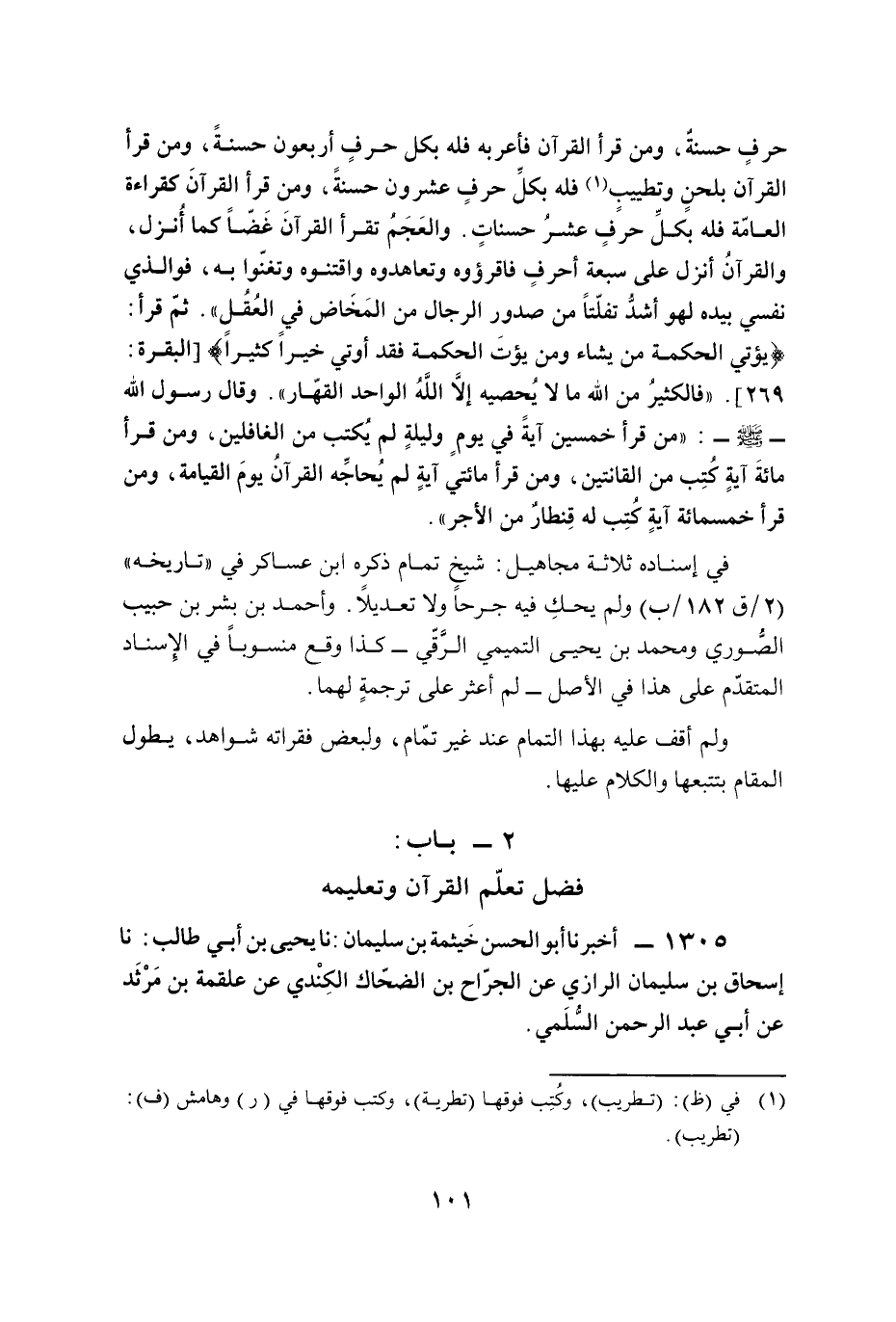 1305 - أخبرنا أبو الحسن خَيثمة بن سليمان: نا يحيى بن أبي طالب: نا إسحاق بن سليمان الرازي عن الجرّاح بن الضحّاك الكِنْدي عن علقمة بن مَرْثَد عن أبي عبد الرحمن السُّلَمي.