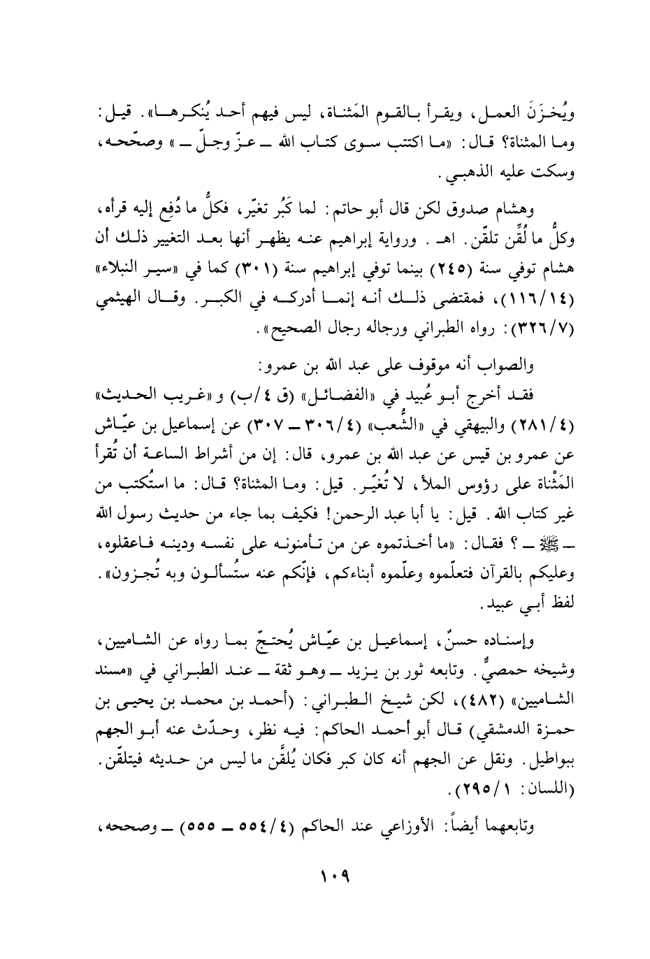 فقد أخرج أبو عُبيد في "الفضائل" (ق 4/ ب) و"غريب الحديث" (4/ 281) والبيهقي في "الشُّعب" (4/ 306 - 307) عن إسماعيل بن عيّاش عن عمرو بن قيس عن عبد الله بن عمرو، قال: إن من أشراط الساعة أن تُقرأ المَثْناة على رؤوس الملأ، لا تُغيّر. قيل: وما المثناة؟ قال: ما استُكتب من غير كتاب الله. قيل: يا أبا عبد الرحمن! فكيف بما جاء من حديث رسول الله - صلى الله عليه وسلم -؟ فقال: "ما أخذتموه عن من تأمنونه على نفسه ودينه فاعقلوه، وعليكم بالقرآن فتعلّموه وعلّموه أبناءكم، فإنّكم عنه ستُسألون وبه تُجزون". لفظ أبي عبيد.